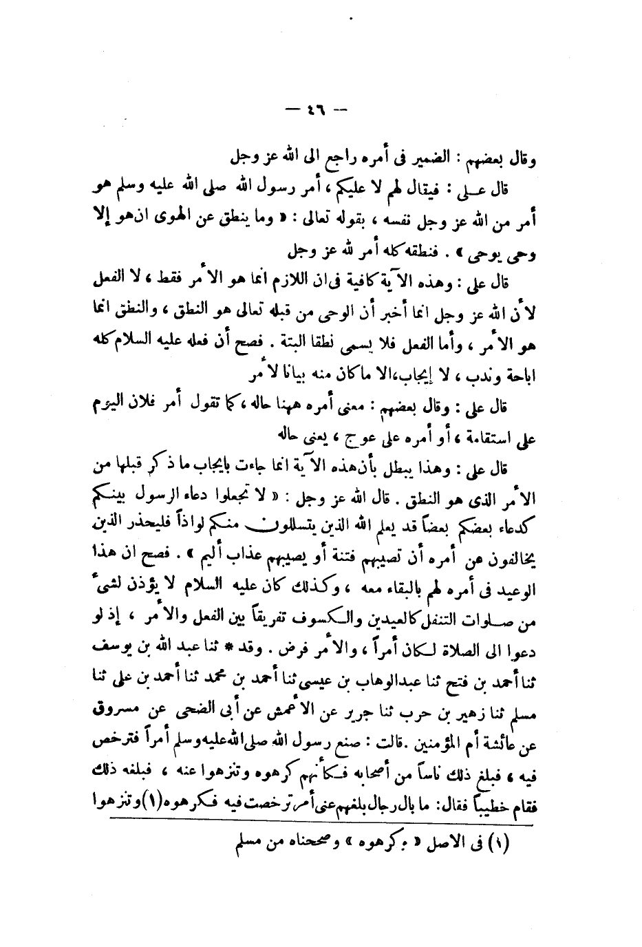 وقال بعضهم الضمير في أمره راجع إلى الله عز وجل قال علي فيقال لهم لا عليكم أمر رسول الله صلى الله عليه وسلم هو أمر من الله عز وجل نفسه بقوله تعالى {وما ينطق عن لهوى * إن هو إلا وحي يوحى} فنطقه كله أمر الله عز وجل قال علي الآية كافية في أن اللازم إنما هو الأمر فقط لا الفعل لأن الله عز وجل إنما أخبر أن الوحي من قبله تعالى هو النطق والنطق إنما هو الأمر وأما الفعل فلا يسمى نطقا البتة فصح أن فعله عليه السلام كله إباحة وندب لا إيجاب إلا ما كان منه بيانا لأمر قال علي وقال بعضهم معنى أمره ههنا حاله كما تقول أمر فلان اليوم على إقامة أو أمره على عوج يعني حاله قال علي وهذا يبطل بأن هذه الآية إنما جاءت بإيجاب ما ذكر قبلها من الأمر الذي هو النطق قال الله عز وجل {لا تجعلوا دعآء لرسول بينكم كدعآء بعضكم بعضا قد يعلم لله لذين يتسللون منكم لواذا فليحذر لذين يخالفون عن أمره أن تصيبهم فتنة أو يصيبهم عذاب أليم} فصح أن هذا الوعيد في أمره لهم بالبقاء معه وكذلك كان عليه السلام لا يؤذن لشيء من صلوات التنفل كالعيدين والكسوف تفريقا بين الفعل والأمر إذ لو دعوا إلى الصلاة لكان أمرا والأمر فرض وقد حدثنا عبد الله بن يوسف ثنا أحمد بن فتح ثنا عبد الوهاب بن عيسى ثنا أحمد بن محمد ثنا أحمد بن علي ثنا مسلم ثنا زهير بن حرب ثنا جرير عن الأعمش عن أبي الضحى عن مسروق عن عائشة أم المؤمنين قالت صنع رسول الله صلى الله عليه وسلم أمرا