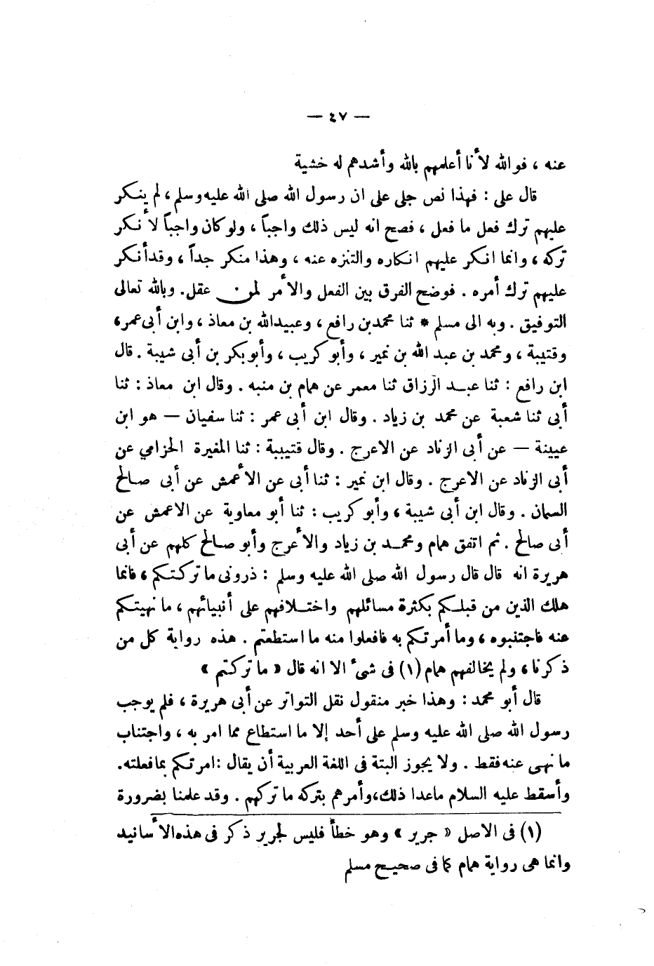 قال علي فهذا نص جلي عن رسول الله صلى الله عليه وسلم لم ينكر عليهم ترك فعل ما فعل فصح أنه ليس ذلك واجبا ولو كان واجبا لأنكر تركه وإنما أنكر عليهم إنكاره والتنزه عنه وهذا منكر جدا وقد أنكر عليهم ترك أمره فوضح الفرق بين الفعل والأمر لمن عقل وبالله تعالى التوفيق وبه إلى مسلم حدثنا محمد بن رافع وعبيد الله بن معاذ وابن أبي عمر وقتيبة ومحمد بن عبد الله بن نمير وأبو كريب وأبو بكر بن أبي شيبة قال ابن رافع ثنا عبد الرزاق ثنا معمر عن همام بن منبه وقال ابن معاذ ثنا أبي ثنا شعبة عن محمد بن زياد وقال ابن أبي عمر ثنا سفيان وهو ابن عيينة عن أبي الزناد عن الأعرج وقال قتيبة ثنا المغيرة الخرامي عن أبي الزناد عن الأعرج وقال ابن نمير ثنا أبي عن الأعمش عن أبي صالح السمان وقال ابن أبي شيبة وأبو كريب ثنا أبو معاوية عن الأعمش عن أبي صالح ثم اتفق همام ومحمد بن زياد والأعرج وأبو صالح كلهم عن أبي هريرة أنه قال قال رسول الله صلى الله عليه وسلم ذروني ما تركتكم فإنما هلك الذين من قبلكم بكثرة مسائلهم واختلافهم عن أنبيائهم ما نهيتكم عنه فاجتنبوه وما أمرتكم به فافعلوا منه ما استطعتم وهذه رواية كل من ذكرنا ولم يخالفهم همام في شيء إلا أنه قال ما تركتكم قال أبو محمد وهذا خبر منقول نقل التواتر عن أبي هريرة فلم يوجب رسول الله صلى الله عليه وسلم على أحد إلا ما استطاع مما أمر به واجتناب ما نهى عنه فقط ولا يجوز البتة في اللغة العربية أن يقال أمرتكم بما فعلته وأسقط عليه السلام ما عدا ذلك وأمرهم بتركه ما تركهم وقد علمنا بضرورة