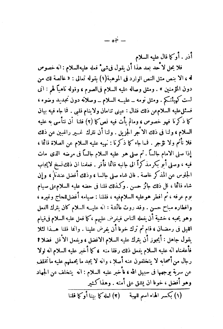 أذر أو كما قال عليه السلام فلا يحل لأحد بعد هذا أن يقول في شيء فعله عليه السلام إنه خصوص له إلا بنص مثل النص الوارد في الموهبة بقوله تعالى {يأيها لنبي إنآ أحللنا لك أزواجك للاتي آتيت أجورهن وما ملكت يمينك ممآ أفآء لله عليك وبنات عمك وبنات عماتك وبنات خالك وبنات خالاتك للاتي هاجرن معك ومرأة مؤمنة إن وهبت نفسها للنبي إن أراد لنبي أن يستنكحها خالصة لك من دون لمؤمنين قد علمنا ما فرضنا عليهم في أزواجهم وما ملكت أيمانهم لكيلا يكون عليك حرج وكان لله غفورا رحيما} ومثل وصاله عليه السلام في الصوم وقوله ناهيا لهم إني لست كهيئتكم ومثل نومه عليه