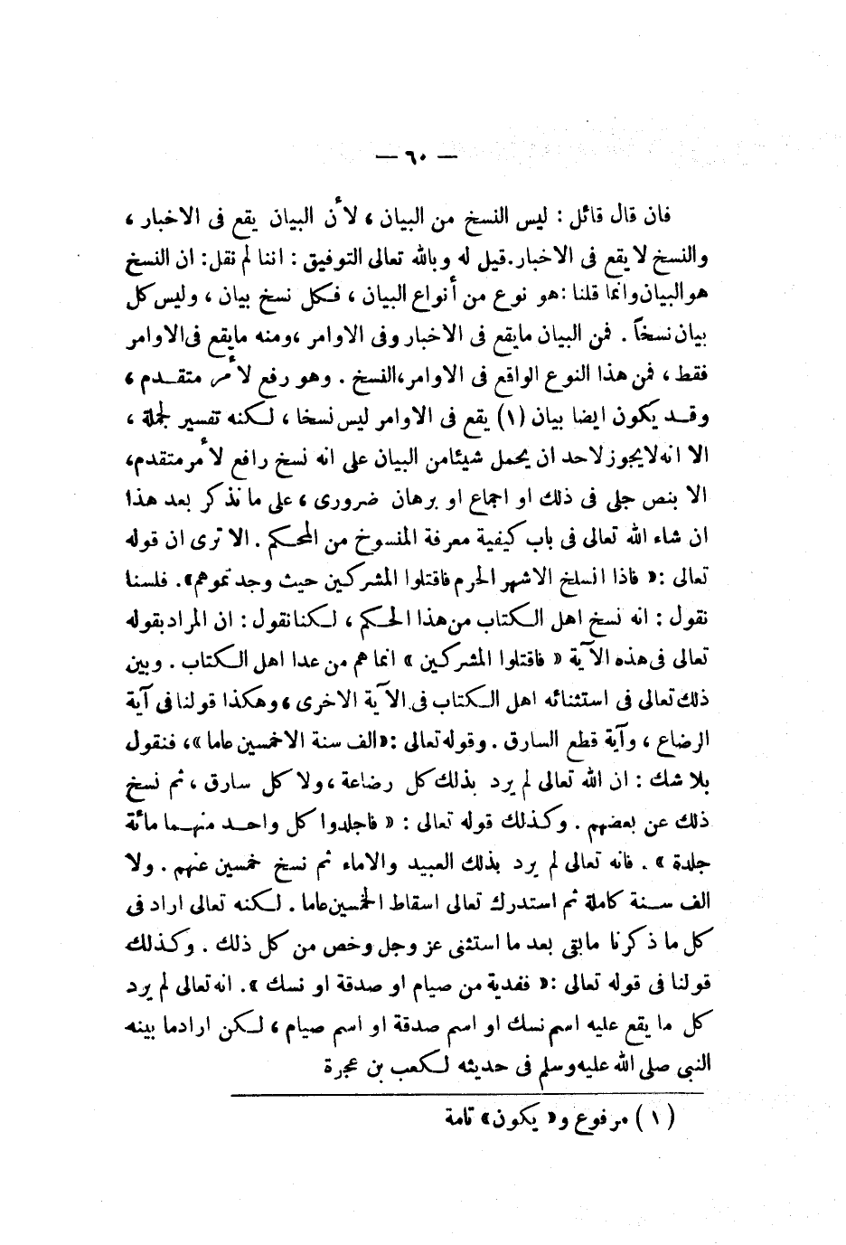 فإن قال قائل ليس النسخ من البيان لأن البيان يقع في الأخبار والنسخ لا يقع في الأخبار قيل له وبالله تعالى التوفيق إننا لم نقل إن النسخ هو البيان وإنما قلنا هو نوع من أنواع البيان فكل نسخ بيان وليس كل بيان نسخا فمن البيان ما يقع في الأخبار وفي الأوامر ومنه ما يقع في الأوامر فقط فمن هذا النوع الواقع في الأوامر النسخ هو رفع لأمر متقدم وقد يكون أيضا بيان يقع في الأوامر ليس نسخا لكنه تفسير لجلة إلا أنه لا يجوز لأحد أن يحمل شيئا من البيان على أنه نسخ رافع لأمر متقدم إلا بنص جلي في ذلك أو إجماع أو برهان ضروري على ما نذكر بعد هذا إن شاء الله تعالى في باب كيفية معرفة المنسوخ من المحكم ألا ترى أن قوله تعالى {فإذا نسلخ لأشهر لحرم فقتلوا لمشركين حيث وجدتموهم وخذوهم وحصروهم وقعدوا لهم كل مرصد فإن تابوا وأقاموا لصلاة وآتوا لزكاة فخلوا سبيلهم إن لله غفور رحيم} فلسنا نقول إنه نسخ أهل الكتاب من هذا الحكم لكنا نقول إن المراد بقوله تعالى في هذه الآية {فإذا نسلخ لأشهر لحرم فقتلوا لمشركين حيث وجدتموهم وخذوهم وحصروهم وقعدوا لهم كل مرصد فإن تابوا وأقاموا لصلاة وآتوا لزكاة فخلوا سبيلهم إن لله غفور رحيم} لله إنما هم من عدا أهل الكتاب وبين ذلك تعالى في استثنائه أهل الكتاب في الآية الأخرى وهكذا قولنا في آية الرضاع وآية قطع السارق وقوله تعالى {ولقد أرسلنا نوحا إلى قومه فلبث فيهم ألف سنة إلا خمسين عاما فأخذهم لطوفان وهم ظالمون} فنقول بلا شك إن الله تعالى لم يرد بذلك كل رضاعة ولا كل سارق ثم نسخ ذلك عن بعضهم وكذلك قوله تعالى {لزانية ولزاني فجلدوا كل واحد منهما مئة جلدة ولا تأخذكم بهما رأفة في دين لله إن كنتم تؤمنون بلله وليوم لآخر وليشهد عذابهما طآئفة من لمؤمنين} فإنه تعالى لم يرد بذلك العبيد والإماء ثم نسخ خمسين عنهم ولا ألف سنة كاملة ثم استدرك تعالى إسقاط الخمسين عاما لكنه تعالى أراد في كل ما