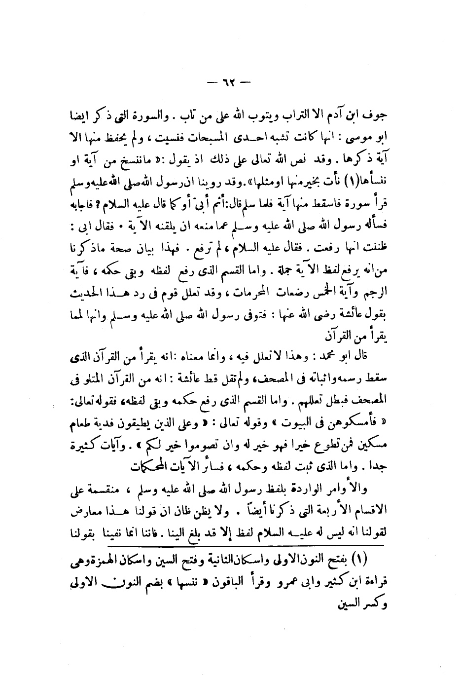 ولم يحفظ منها إلا آية ذكرها وقد نص الله تعالى على ذلك إذ يقول {ما ننسخ من آية أو ننسها نأت بخير منها أو مثلها ألم تعلم أن لله على كل شيء قدير} وقد روينا أن رسول الله صلى الله عليه وسلم قرأ سورة فأسقط منها آية فلما سلم قال أثم أبي أو كما قال عليه السلام فأجابه فسأله رسول الله صلى الله عليه وسلم عما منعه أن يلقنه الآية فقال أبي ظننت أنها رفعت فقال عليه السلام لم ترفع فهذا بيان صحة ما ذكرنا من أنه يرفع لفظ الآية جملة وأما القسم الذي رفع لفظه وبقي حكمه فآية الرجم وآية الخمس رضعات المحرمات وقد تعلل قوم في رد هذا الحديث بقول عائشة رضي الله عنها فتوفي رسول الله صلى الله عليه وسلم وأنهما لمما يقرأ من القرآن قال أبو محمد وهذا لا تعلل فيه وإنما معناه أنه يقرأ من القرآن الذي سقط رسمه وإثباته في المصحف ولم تقل قط عائشة إنه من القرآن المتلو في المصحف فبطل تعللهم وأما القسم الذي رفع حكمه وبقي لفظه فقوله تعالى {وللاتي يأتين لفاحشة من نسآئكم فستشهدوا عليهن أربعة منكم فإن شهدوا فأمسكوهن في لبيوت حتى يتوفاهن لموت أو يجعل لله لهن سبيلا} وقوله تعالى {أياما معدودات فمن كان منكم مريضا أو على سفر فعدة من أيام أخر وعلى لذين يطيقونه فدية طعام مسكين فمن تطوع خيرا فهو خير له وأن تصوموا خير لكم إن كنتم تعلمون} وآيات كثيرة جدا وأما الذي ثبت لفظه وحكمه فسائر الآيات المحكمات والأوامر الواردة بأمر رسول الله صلى الله عليه وسلم منقسمة على الأقسام الأربعة التي ذكرنا أيضا ولا يظن ظان أن قولنا هذا معارض لقولنا إنه ليس له عليه السلام لفظ إلا قد بلغ إلينا فإننا إنما نفينا بقولنا