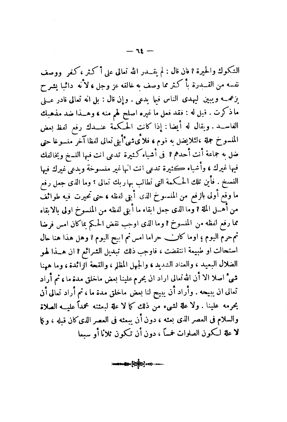 حتى تحيرت فيه طوائف من أهل الملة وما الذي جعل إبقاء ما أبقي لفظه المنسوخ أولى بالإبقاء مما رفع لفظه من المنسوخ وما الذي أوجب نقض الحكم بما كان أمس فرضا ثم حرم اليوم أو ما كان حراما أمس ثم أبيح اليوم وهل هذا هنا حال استحالت أو طبيعة انتقضت فأوجب ذلك تبديل الشرائع إن هذا لهو الضلال البعيد والغناء الشديد والجهل المظلم والقحة الزائدة وما ههنا شيء أصلا إلا أن الله تعالى أراد أن يحرم علينا بعض ما خلق مدة ما ثم أراد تعالى أن يحرمه علينا ولا علة لشيء من ذلك كما لا علة لبعثه محمدا عليه الصلاة والسلام في العصر الذي بعثه دون أن يبعثه في العصر الذي كان قبله وكما لا علة لكون الصلوات خمسا دون أن تكون ثلاثا أو سبعا