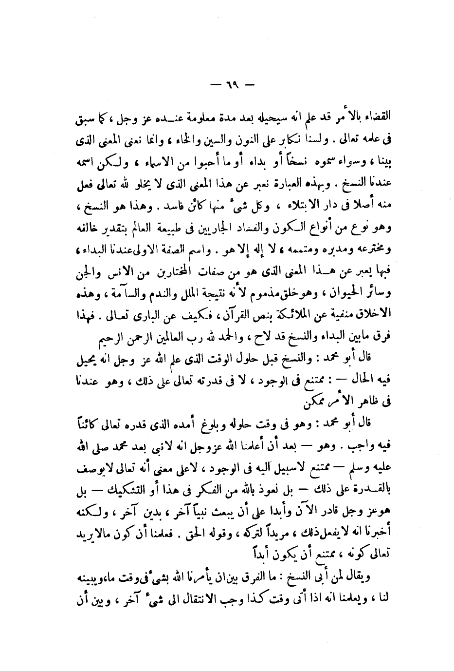 بتقدير خالقه ومخترعه ومدبره ومتممه لا إله إلا هو واسم الصفة الأولى عندنا البداء فيها يعبر عن هذا المعنى الذي هو من صفات المختارين من الإنس والجن وسائر الحيوان وهو خلق مذموم لأنه نتيجة الملل والندم والسآمة وهذه الأخلاق منفية عن الملائكة بنص القرآن فكيف عن الباري تعالى فهذا فرق ما بين البداء والنسخ قد لاح والحمد لله رب العالمين الرحمن الرحيم قال أبو محمد والنسخ قبل حلول الوقت الذي علم الله عز وجل أنه يحيل فيه الحال ممتنع في الوجود لا في قدرته تعالى على ذلك وهو عندنا في ظاهر الأمر ممكن قال أبو محمد وهو في وقت حلوله وبلوغ أمده الذي قدره تعالى كائنا فيه واجب وهو بعد أن علمنا الله عز وجل أنه لا نبي بعد محمد صلى الله عليه وسلم ممتنع لا سبيل إليه في الوجود لا على معنى أنه تعالى لا يوصف بالقدرة على ذلك بل نعوذ بالله من الفكر في هذا أو التشكيك بل هو عز وجل قادر الآن وأبدا على أن يبعث نبيا آخر بدين آخر ولكنه أخبرنا أنه لا يفعل ذلك مريدا لتركه وقوله الحق فعلمنا أن كون ما لا يريد تعالى كونه ممتنع أن يكون أبدا ويقال لمن أبى النسخ ما الفرق بين أن يأمرنا الله بشيء في وقت ما ويبينه لنا ويعلمنا أنه إذا أتى وقت كذا وجب الانتقال إلى شيء آخر وبين أن