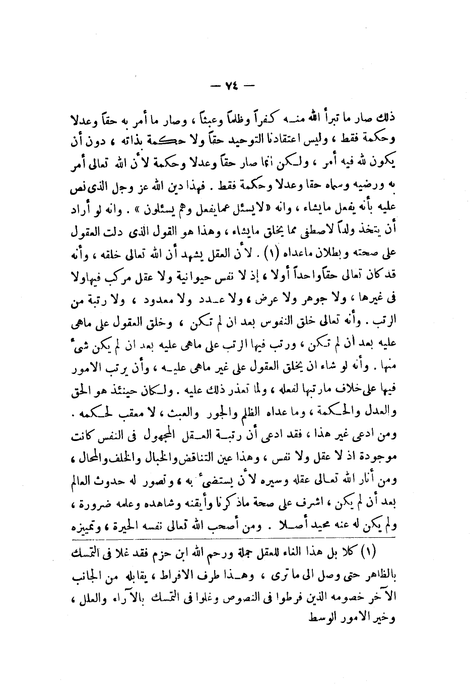 ذلك صار ما تبرأ الله منه كفرا وظلما وعبثا وصار ما أمر به حقا وعدلا وحكمة فقط وليس اعتقادنا التوحيد حقا ولا حكمة بذاته دون أن يكون لله فيه أمر ولكن إنما صار حقا وعدلا وحكمة لأن الله تعالى أمر به ورضيه وسماه حقا وعدلا وحكمة فقط فهذا دين الله عز وجل الذي نص عليه بأن يفعل ما يشاء وأنه {لا يسأل عما يفعل وهم يسألون} وأنه لو أراد أن يتخذ ولدا لاصطفى مما يخلق ما يشاء وهذا هو القول الذي دلت العقول على صحته وبطلان ما عداه لأن العقل يشهد أن الله تعالى خلقه وأنه كان تعالى حقا واحدا أولا إذ لا نفس حيوانية ولا عقل مركب فيها ولا في غيرها ولا جوهر ولا عرض ولا عدد ولا معدود ولا رتبة من الرتب وأنه تعالى خلق النفوس بعد أن لم تكن وخلق العقول على ما هي عليه بعد أن لم تكن ورتب فيها الرتب على ما هي عليه بعد أن لم يكن شيء منها وأنه لو شاء أن يخلق العقول على غير ما هي عليه وأن يرتب الأمور فيها على خلاف ما رتبها لفعله ولما تعذر ذلك عليه ولكان حينئذ هو الحق والعدل والحكمة وما عداه الظلم والجور والعبث لا معقب لحكمه ومن ادعى غير هذا فقد ادعى أن رتبة العقل المجهول في النفس كانت موجودة إذ لا عقل ولا نفس وهذا عين التناقض والخبال والخلف والمحال ومن أنار الله تعالى عقله وسيره لأن يستضيء به وتصور له حدوث العالم بعد أن لم يكن أشرف على