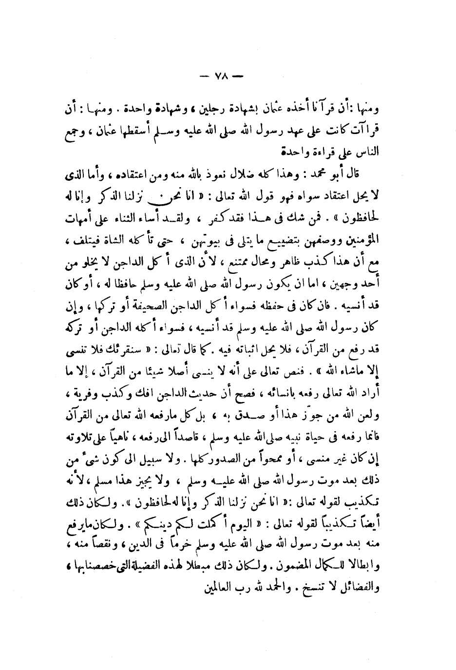 ومنها أن قرآنا أخذه عثمان بشهادة رجلين وشهادة واحدة ومنها أن قراءات كانت على عهد رسول الله صلى الله عليه وسلم أسقطها عثمان وجمع الناس على قراءة واحدة قال أبو محمد وهذا كله ضلال نعوذ بالله منه ومن اعتقاده وأما الذي لا يحل اعتقاد سواه فهو قول الله تعالى {إنا نحن نزلنا لذكر وإنا له لحافظون} فمن شك في هذا كفر ولقد أساء الثناء على أمهات المؤمنين ووصفهن بتضييع ما يتلى في بيوتهن حتى تأكله الشاة فيتلف مع أن هذا كذب ظاهر ومحال ممتنع لأن الذي أكل الداجن لا يخلو من أحد وجهين إما أن يكون رسول الله صلى الله عليه وسلم حافظا له أو كان قد أنسيه فإن كان في حفظه فسواء أكل الدواجن الصحيفة أو تركها وإن كان رسول الله صلى الله عليه وسلم قد أنسيه فسواء أكله الداجن أو تركه قد رفع من القرآن فلا يحل إثباته فيه كما قال تعالى {سنقرئك فلا تنسى * إلا ما شآء لله إنه يعلم لجهر وما يخفى} فنص تعالى على أنه لا ينسى أصلا شيئا من القرآن إلا ما أراد تعالى رفعه بإنسائه فصح أن حديث الداجن إفك وكذب وفرية ولعن الله من جوز هذا أو صدق به بل كل ما رفعه الله
