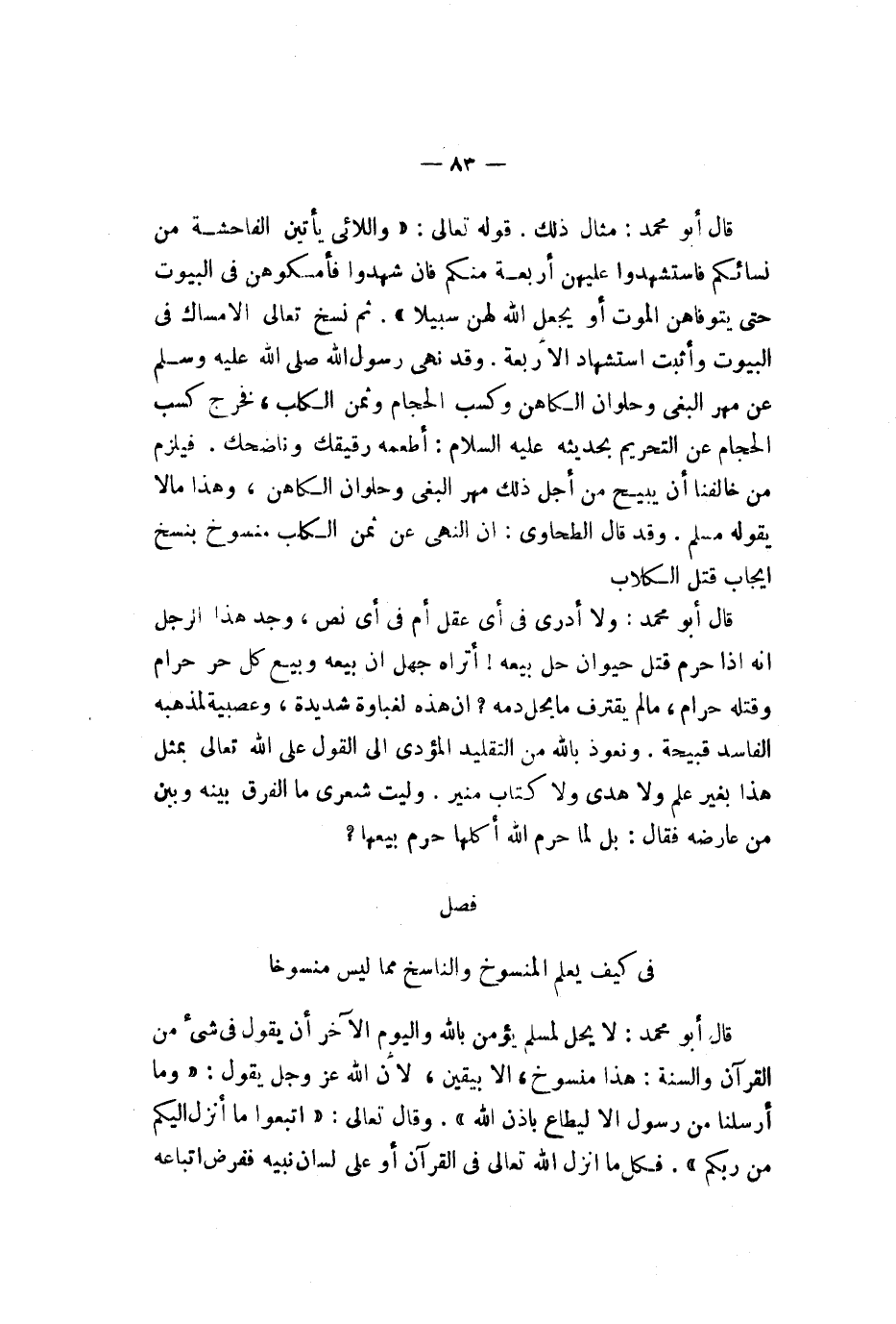 قال أبو محمد لا يحل لمسلم يؤمن بالله واليوم الآخر أن يقول في شيء من القرآن والسنة هذا منسوخ إلا بيقين لأن الله عز وجل يقول {وما أرسلنا من رسول ألا ليطاع بإذن لله ولو أنهم إذ ظلموا أنفسهم جآءوك فستغفروا لله وستغفر لهم لرسول لوجدوا لله توابا رحيما} وقال تعالى {قل من حرم زينة لله لتي أخرج لعباده والطيبات من لرزق قل هي للذين آمنوا في لحياة لدنيا خالصة يوم لقيامة كذلك نفصل لآيات لقوم يعلمون} فكل ما أنزل الله تعالى في القرآن أو على لسان نبيه ففرض اتباعه