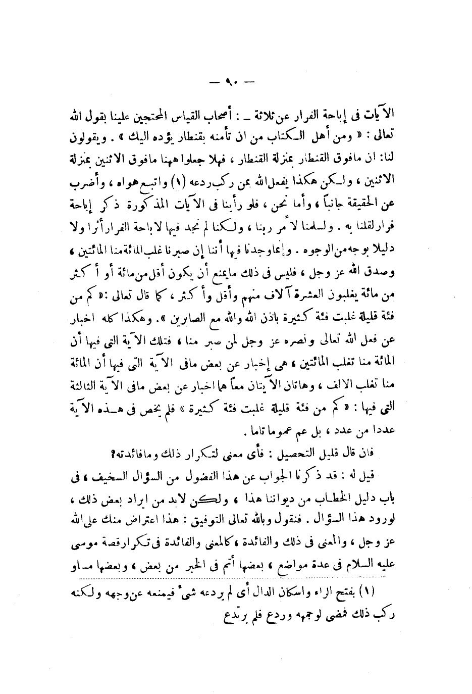 الآيات في إباحة الفرار عن ثلاثة أصحاب القياس المحتجين علينا بقول الله تعالى {ومن أهل لكتاب من إن تأمنه بقنطار يؤده إليك ومنهم من إن تأمنه بدينار لا يؤده إليك إلا ما دمت عليه قآئما ذلك بأنهم قالوا ليس علينا في لأميين سبيل ويقولون على الله لكذب وهم يعلمون} ويقول لنا إن ما فوق القنطار بمنزلة القنطار فهلا جعلوا ههنا ما فوق الاثنين بمنزلة الاثنين ولكن هكذا يفعل الله بمن ركب ردعه واتبع هواه وأضرب عن الحقيقة جانبا وأما نحن فلو رأينا في الآيات المذكورة ذكر إباحة فرار لقلنا به ولسلمنا
