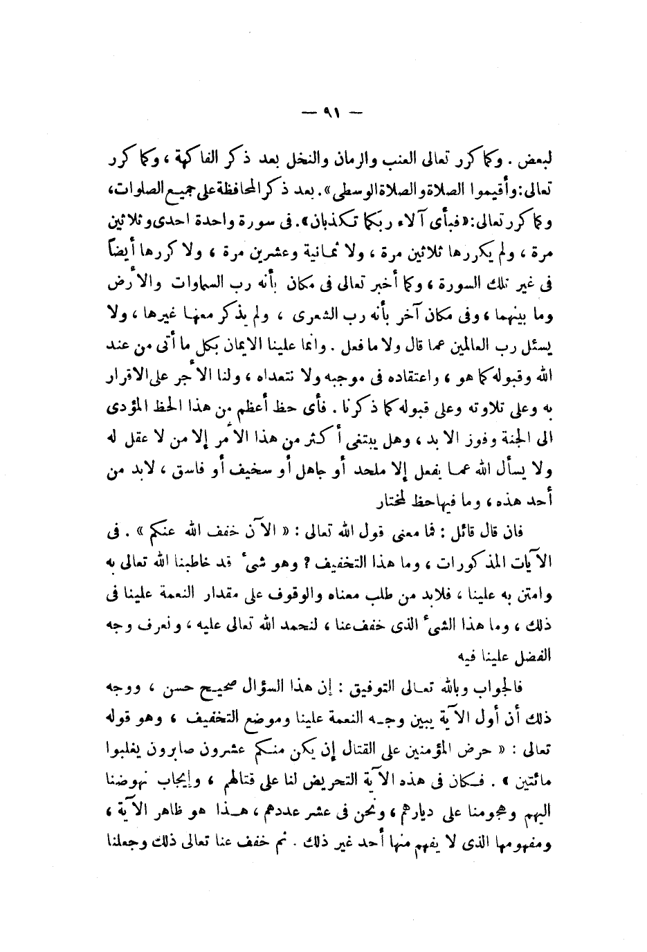 المحافظة على جميع الصلوات وكما كرر تعالى {فبأي آلاء ربكما تكذبان} في سورة واحدة إحدى وثلاثين مرة ولم يكررها ثلاثين مرة لا ثمانية وعشرين مرة ولا كررها أيضا في غير تلك السورة وكما أخبر تعالى في مكان بأنه رب السموات والأرض وما بينهما في مكان آخر بأنه رب الشعرى ولم يذكر معها غيرها ولا يسأل رب العالمين عما قال ولا ما فعل وإنما علينا الإيمان بكل ما أتى من عند الله وقبوله كما هو واعتقاده في موجبه ولا نتعداه ولنا الأجر على الإقرار به وعلى تلاوته وعلى قبوله كما ذكرنا فأي حظ أعظم من هذا الحظ المؤدي إلى الجنة وفوز الأبد وهل يبتغي أكثر من هذا الأمر إلا من لا عقل له ولا يسأل الله عما يفعل إلا ملحد أو جاهل أو سخيف أو فاسق لا بد من أحد هذه وما فيها حظ لمختار فإن قال قائل فما معنى قول الله تعالى {لآن خفف لله عنكم وعلم أن فيكم ضعفا فإن يكن منكم مئة صابرة يغلبوا مئتين وإن يكن منكم ألف يغلبوا ألفين بإذن لله ولله مع لصابرين} في