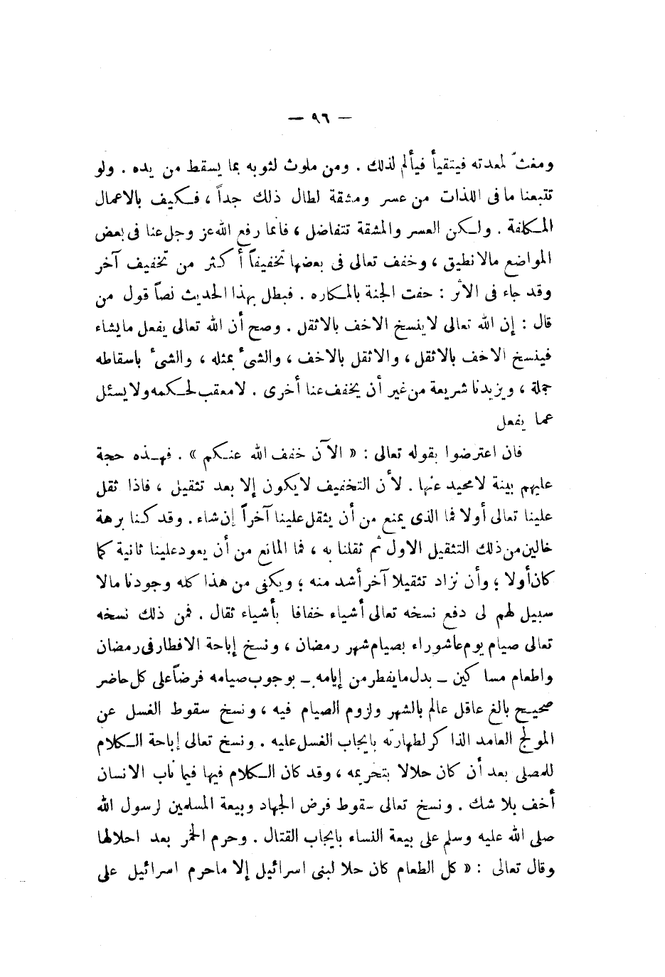 ومغث لمعدته فيتقيأ فيألم لذلك ومن ملوث لثوبه بما يسقط من يده ولو تتبعنا ما في اللذات من عسر ومشقة لطال ذلك جدا فكيف بالأعمال المكلفة ولكن العسر والمشقة تتفاضل فإنما رفع الله عز وجل عنا في بعض المواضع ما لا نطيق وخفف تعالى في بعضها تخفيفا أكثر من تخفيف آخر وقد جاء في الأثر حفت الجنة بالمكاره فبطل بهذا الحديث نصا قول من قال إن الله تعالى لا ينسخ الأخف بالأثقل وصح أن الله تعالى يفعل ما يشاء فينسخ الأخف بالأثقل والأثقل بالأخف والشيء بمثله والشيء بإسقاطه جملة ويزيدنا شريعة من غير أن يخفف عنا أخرى لا معقب لحكمه ولا يسأل عما يفعل فإن اعترضوا بقوله تعالى {لآن خفف لله عنكم وعلم أن فيكم ضعفا فإن يكن منكم مئة صابرة يغلبوا مئتين وإن يكن منكم ألف يغلبوا ألفين بإذن لله ولله مع لصابرين} فهذه حجة عليهم بينة لا محيد عنها لأن التخفيف لا يكون إلا بعد تثقيل فإذا ثقل علينا تعالى أولا فما الذي يمنع
