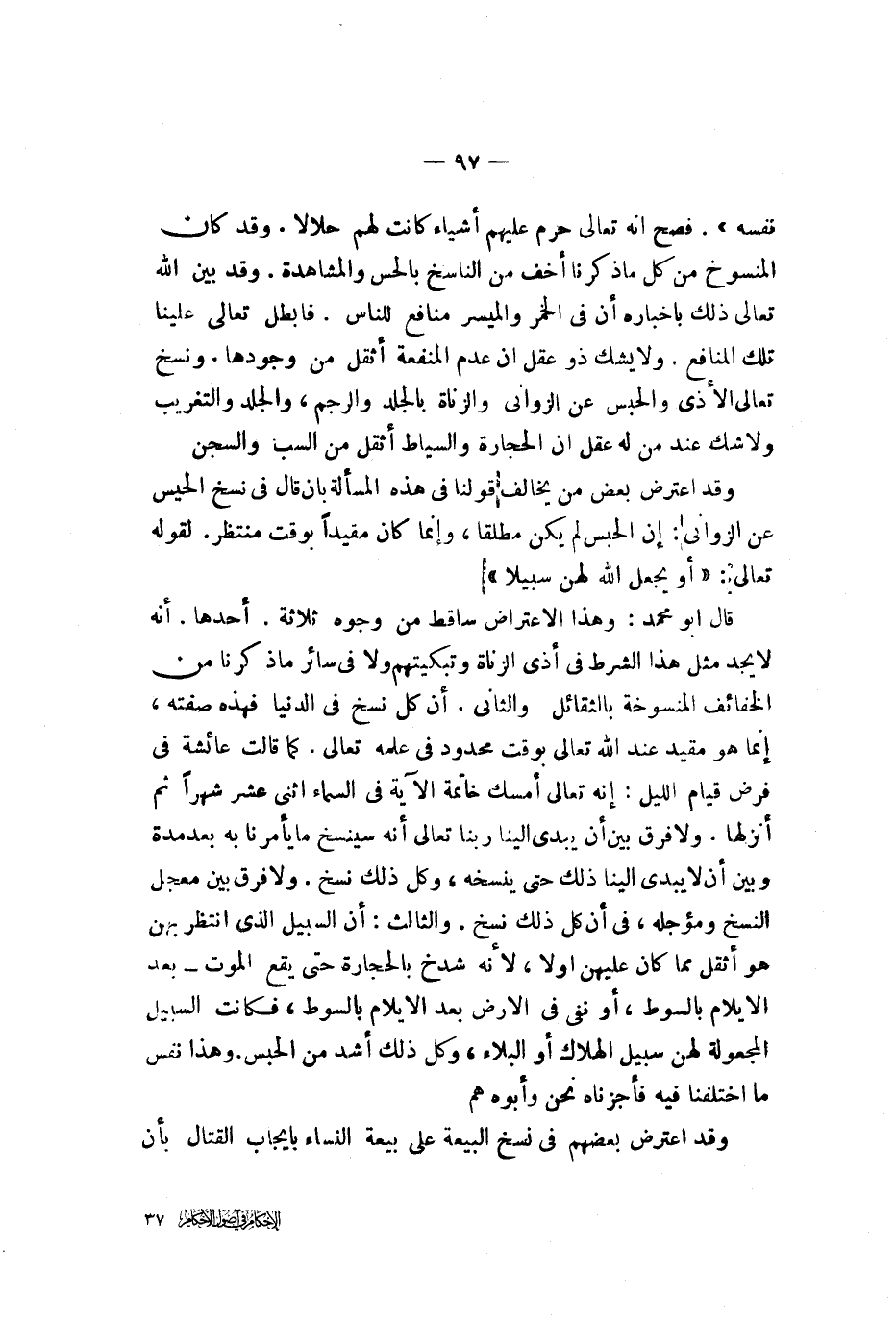والثالث أن السبيل الذي انتظر بهن هو أثقل مما كان عليهن أولا لأنه شدخ بالحجارة حتى يقع الموت بعد الإيلام بالسوط أو نفي في الأرض بعد الإيلام بالسوط فكانت السبيل المحمولة لهن سبيل الهلاك أو البلاء وكل ذلك أشد من الحبس وهذا نفس ما اختلفنا فيه فأجزناه نحن وأبوه هم وقد اعترض بعضهم في نسخ البيعة على بيعة النساء بإيجاب القتال بأن