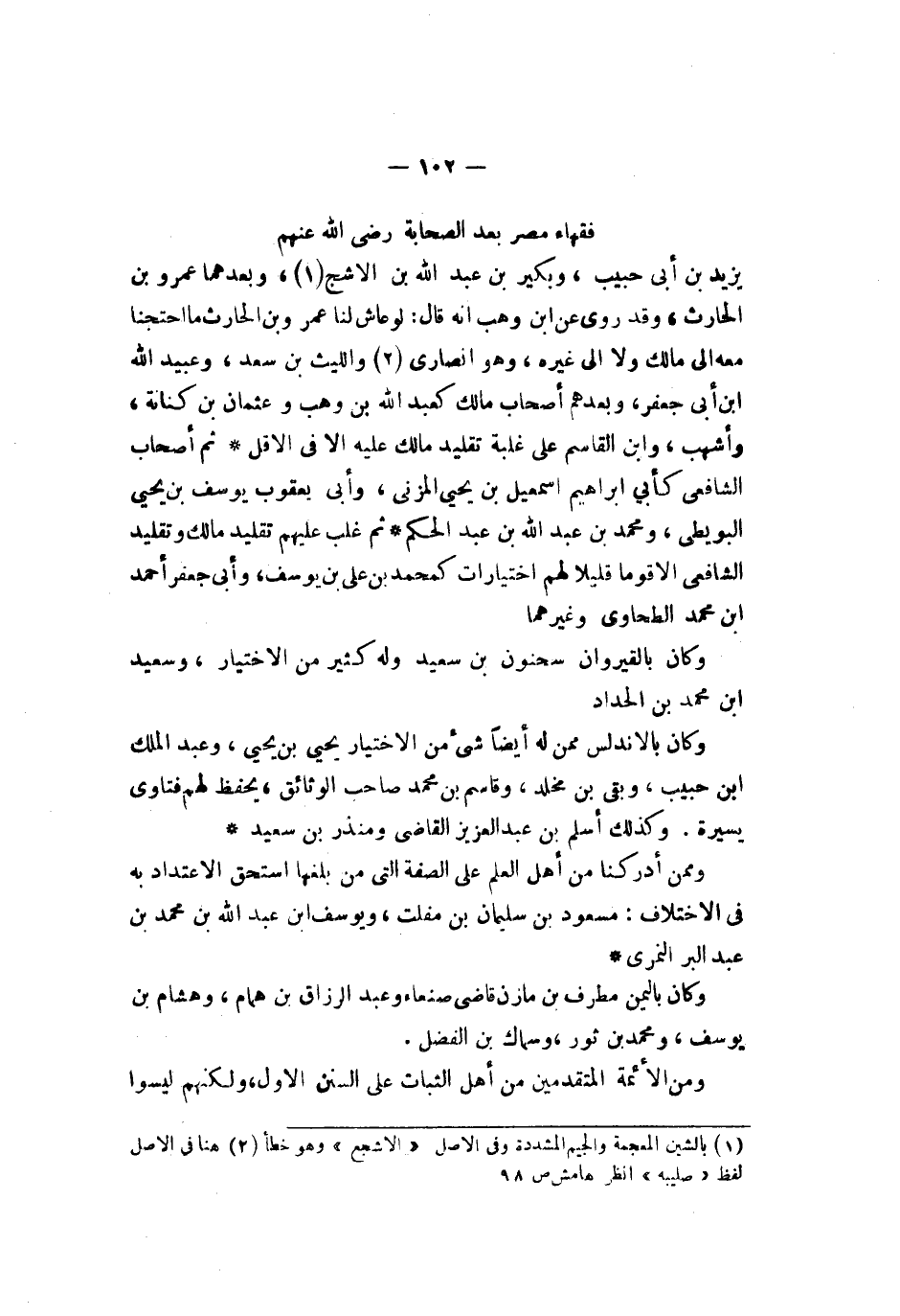 فقهاء مصر بعد الصحابة رضي الله عنهم يزيد بن أبي حبيب وبكير بن عبد الله بن الأشج وبعدهما عمرو بن الحارث وقد روي عن ابن وهب أنه قال لو عاش لنا عمرو بن الحارث ما احتجنا معه إلى مالك ولا إلى غيره وهو أنصاري والليث بن سعد وعبيد الله بن أبي جعفر وبعدهم أصحاب مالك كعبد الله بن وهب وعثمان بن كنانة وأشهب وابن القاسم على غلبة تقليد مالك عليه إلا في الأقل ثم أصحاب الشافعي كأبي إبراهيم إسماعيل بن يحيى المزني وأبي يعقوب يوسف بن يحيى البويطي ومحمد بن عبد الله بن عبد الحكم ثم غاب عليهم تقليد مالك وتقليد الشافعي إلا قوما قليلا لهم اختيارات كمحمد بن يوسف وأبي جعفر أحمد بن محمد الصحاوي وغيرهما وكان بالقيروان سحنون بن سعيد وله كثير من الاختيار وسعيد بن محمد بن الحداد وكان بالأندلس ممن له أيضا شيء من الاختيار يحيى بن يحيى وعبد الملك بن حبيب وبقي بن مخلد وقاسم بن محمد صاحب الوثائق يحفظ لهم فتاوى يسيرة وكذلك أسلم بن عبد العزيز القاضي ومنذر بن سعيد وممن أدركنا من أهل العلم على الصفة التي من بلغها استحق الاعتداد به في الاختلاف مسعود بن سليمان بن مفلت ويوسف بن عبد الله بن محمد بن عبد البر النمري