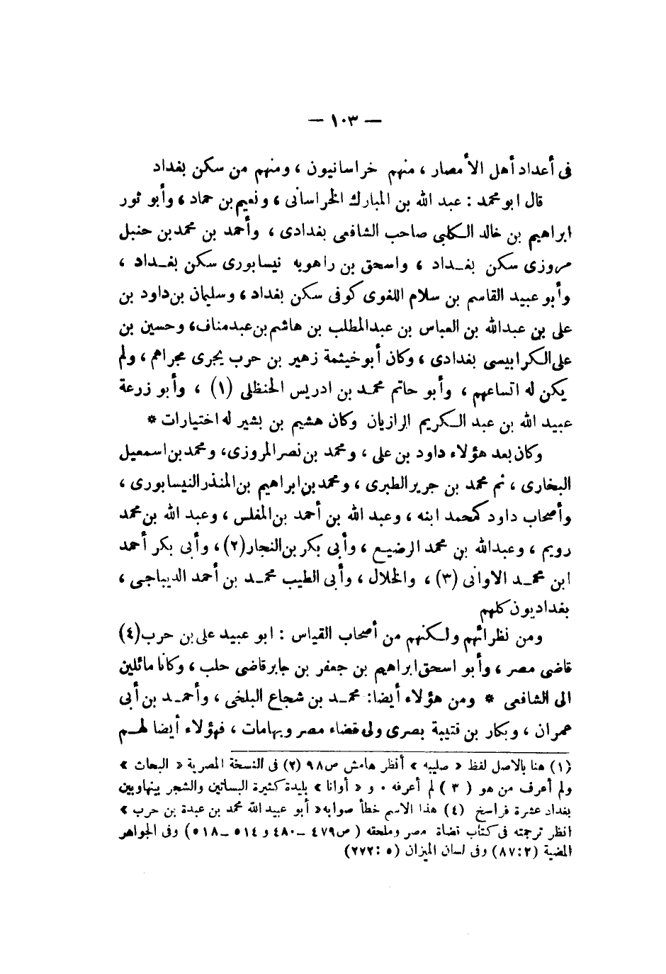 في أعداد أهل الأمصار منهم خراسانيون ومنهم من سكن بغداد قال أبو محمد عبد الله بن المبارك الخراساني ونعيم بن حماد وأبو ثور إبراهيم بن خالد الكلبي صاحب الشافعي بغدادي وأحمد بن محمد بن حنبل مروزي سكن بغداد وإسحاق بن راهويه نيسابوري سكن بغداد وأبو عبيد القاسم بن سلام اللغوي كوفي سكن بغداد وسليمان بن داود بن علي بن عبد الله بن العباس بن عبد المطلب بن هاشم بن عبد مناف وحسين بن علي الكرابيسي بغدادي وكان أبو خيثمة زهير بن حرب يجري مجراهم ولم يكن له اتساعهم وأبو حاتم محمد بن إدريس الحنظلي صليبة وأبو زرعة عبيد الله بن عبد الكريم الرازيان وكان هشيم بن بشير له اختيارات وكان بعد هؤلاء داود بن علي ومحمد بن نصر المروزي ومحمد بن إسماعيل البخاري ثم محمد بن جرير الطبري ومحمد بن إبراهيم بن المنذر النيسابوري وأصحاب داود كمحمد ابنه وعبد الله بن أحمد بن المغلس وعبد الله بن محمد رويم وعبد الله بن محمد الرضيع وأبي بكر بن النجار وأبي بكر أحمد بن محمد الأواني والخلال وأبي الطيب محمد بن أحمد الدياجي بغداديون كلهم ومن نظرائهم ولكنهم من أصحاب القياس أبو عبيد علي بن حرب قاضي مصر وأبو إسحاق إبراهيم بن جعفر بن جابر قاضي حلب وكانا مائلين إلى الشافعي ومن هؤلاء أيضا محمد بن شجاع البلخي وأحمد بن أبي عمران وبكار بن قتيبة بصري ولي قضاء مصر وبها مات فهؤلاء أيضا لهم