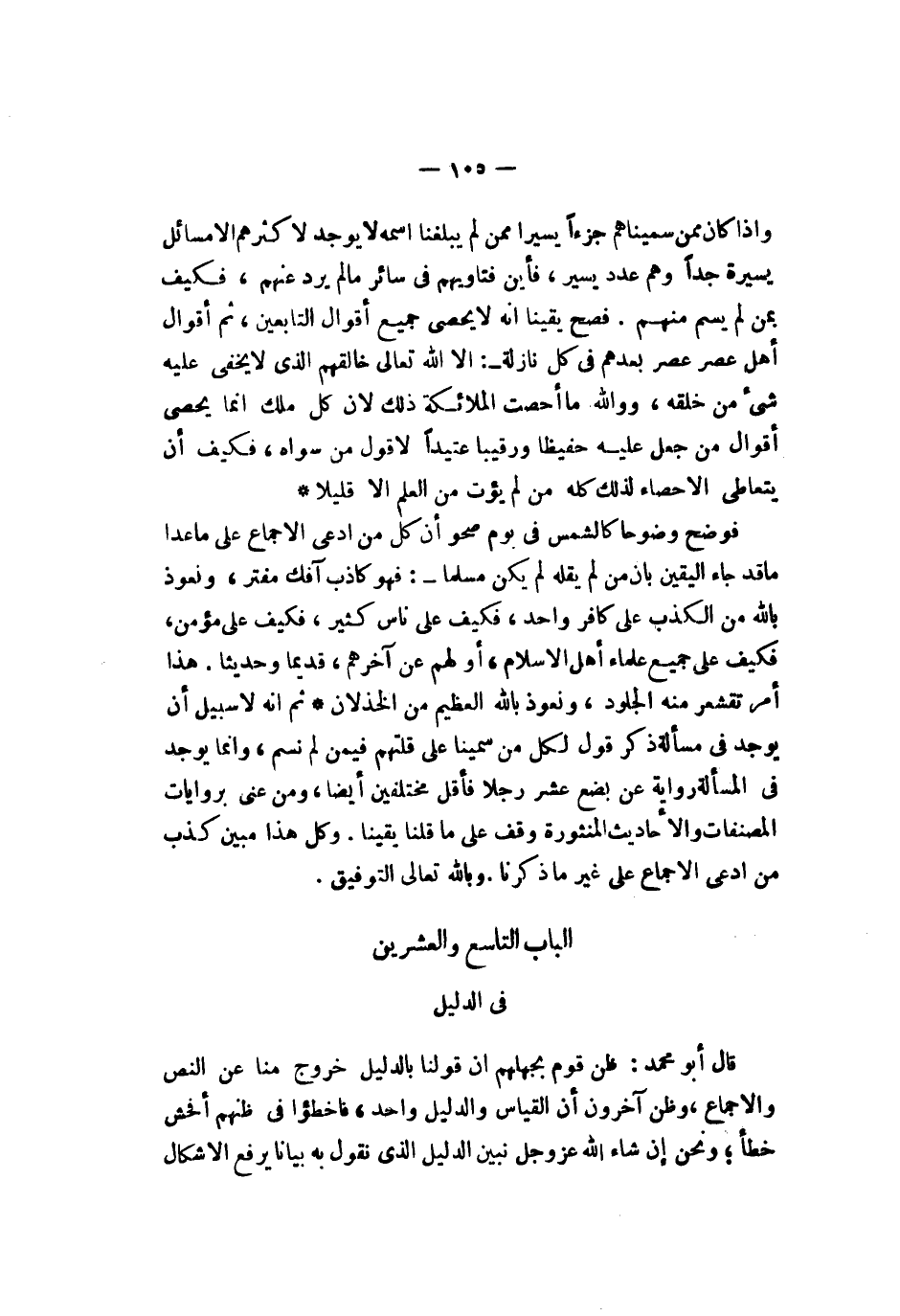 وإذا كان ممن سميناهم جزءا يسيرا ممن لم يبلغنا اسمه لا يوجد لأكثرهم إلا مسائل يسيرة جدا وهم عدد يسير فأين فتاويهم في سائر ما لم يرد عنهم فكيف بمن لم يسم منهم فصح يقينا أنه لا يحصي جميع أقوال التابعين ثم أقوال أهل عصر بعدهم في كل نازلة إلا الله تعالى خالقهم الذي لا يخفى عليه شيء من خلقه ووالله ما أحصت الملائكة ذلك لأن كل ملك إنما يحصي أقوال من جعل عليه حفيظا ورقيبا عتيدا لا قول من سواه فكيف أن يتعاطى الاحصاء لذلك كله من لم يؤت العلم إلا قليلا فوضح وضوحا كالشمس في يوم صحو أن كل من ادعى الإجماع على ما عدا ما قد جاء اليقين بأن من لم يقله لم