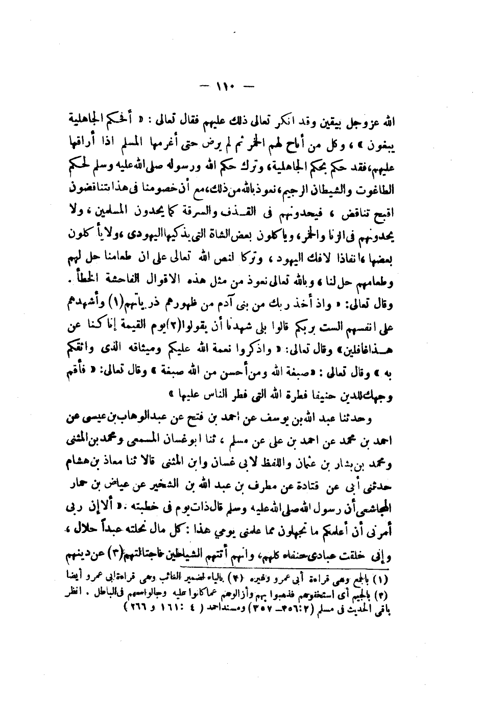وقال تعالى {وذكروا نعمة لله عليكم وميثاقه لذي واثقكم به إذ قلتم سمعنا وأطعنا وتقوا لله إن لله عليم بذات لصدور} وقال تعالى {صبغة لله ومن أحسن من لله صبغة ونحن له عابدون} وقال تعالى {فأقم وجهك للدين حنيفا فطرة لله لتي فطر لناس عليها لا تبديل لخلق لله ذلك لدين لقيم ولكن أكثر لناس لا يعلمون} وحدثنا عبد الله بن يوسف عن أحمد بن فتح عن عبد الوهاب بن عيسى عن أحمد بن محمد عن أحمد بن علي عن مسلم ثنا أبو غسان المسمعي ومحمد بن المثنى ومحمد بن بشار بن عثمان واللفظ لأبي غسان وابن المثنى قالا ثنا معاذ بن هشام حدثني أبي عن قتادة عن مطرف بن عبد الله بن عبد الله بن الشخير عن عياض بن حمار المجاشعي أن رسول الله صلى الله عليه وسلم قال ذات يوم في خطبته ألا إن ربي أمرني أن أعلمكم ما تجهلون مما علمني يومي هذا كل مال نحلته عبدا حلال وإني خلقت عبادي حنفاء كلهم وإنهم أتتهم الشياطين فاجتالتهم عن دينهم