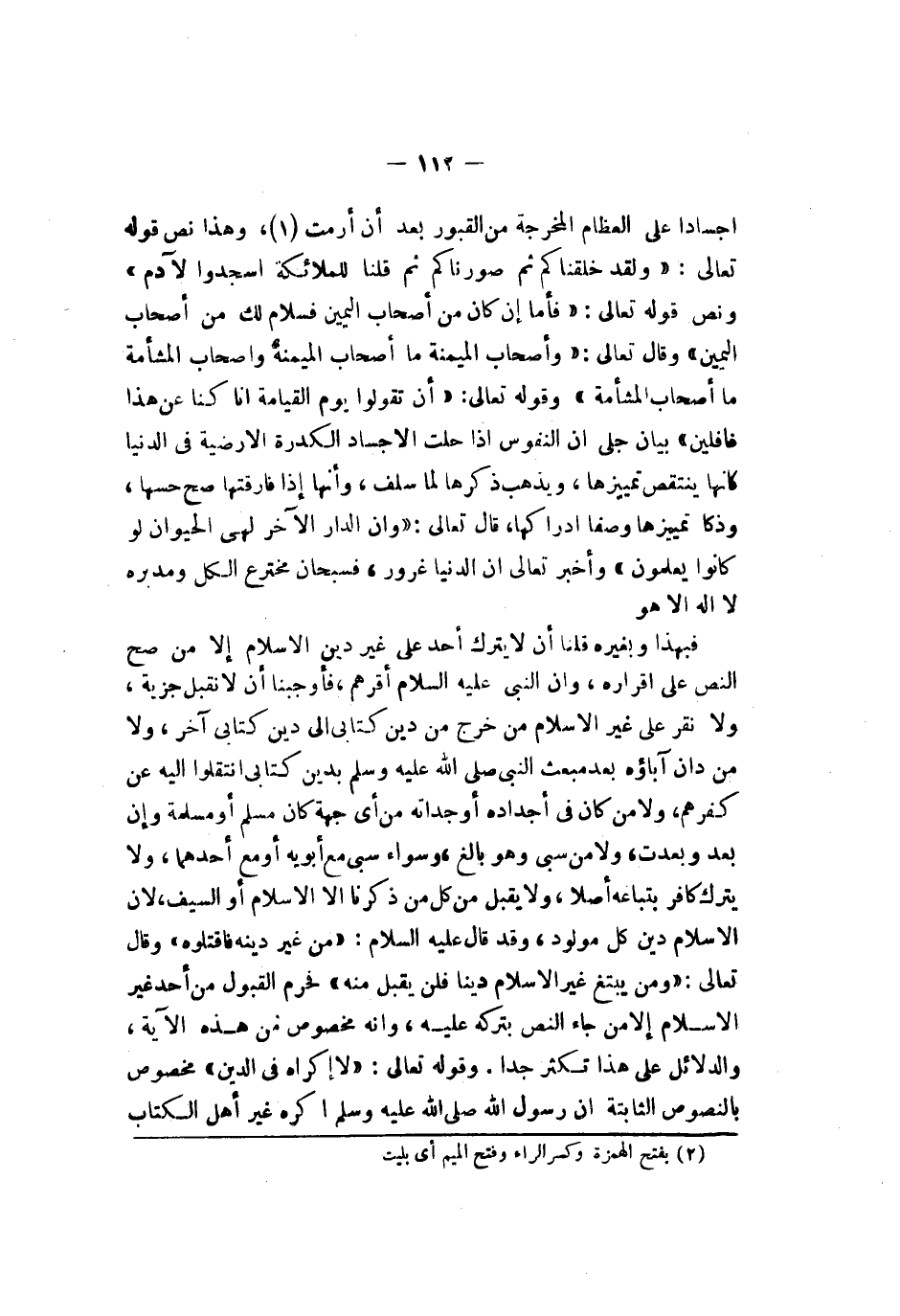 فبهذا وبغيره قلنا ألا يترك أحد على غير دين الإسلام إلا من صح النص على إقراره وأن النبي عليه السلام أقرهم فأوجبنا ألا نقبل جزية ولا نقر على غير الإسلام من خرج من دين كتابي إلى دين كتابي آخر ولا من دان آباؤه بعد مبعث النبي صلى الله عليه وسلم بدين كتابي انتقلوا إليه عن كفرهم ولا من كان في أجداده أو جداته من أي جهة كان مسلم أو مسلمة وإن بعد وبعدت ولا من سبي وهو بالغ وسواء سبي مع أبويه أو مع أحدهما ولا يترك كافر بتباعه أصلا ولا يقبل من كل من ذكرنا إلا الإسلام أو السيف لأن الإسلام دين كل مولود وقد قال عليه السلام من غير دينه فاقتلوه وقال تعالى {ومن يبتغ غير لإسلام دينا فلن يقبل منه وهو في لآخرة من لخاسرين} فحرم القبول من أحد غير الإسلام إلا من جاء النص بتركه عليه وأنه مخصوص من هذه الآية والدلائل على هذا تكثر جدا وقوله تعالى {لا إكراه في لدين قد تبين لرشد من لغي فمن يكفر بلطاغوت ويؤمن بلله فقد ستمسك بلعروة لوثقى لا نفصام لها ولله سميع عليم} مخصوص بالنصوص الثابتة أن رسول الله صلى الله عليه وسلم أكره غير أهل الكتاب