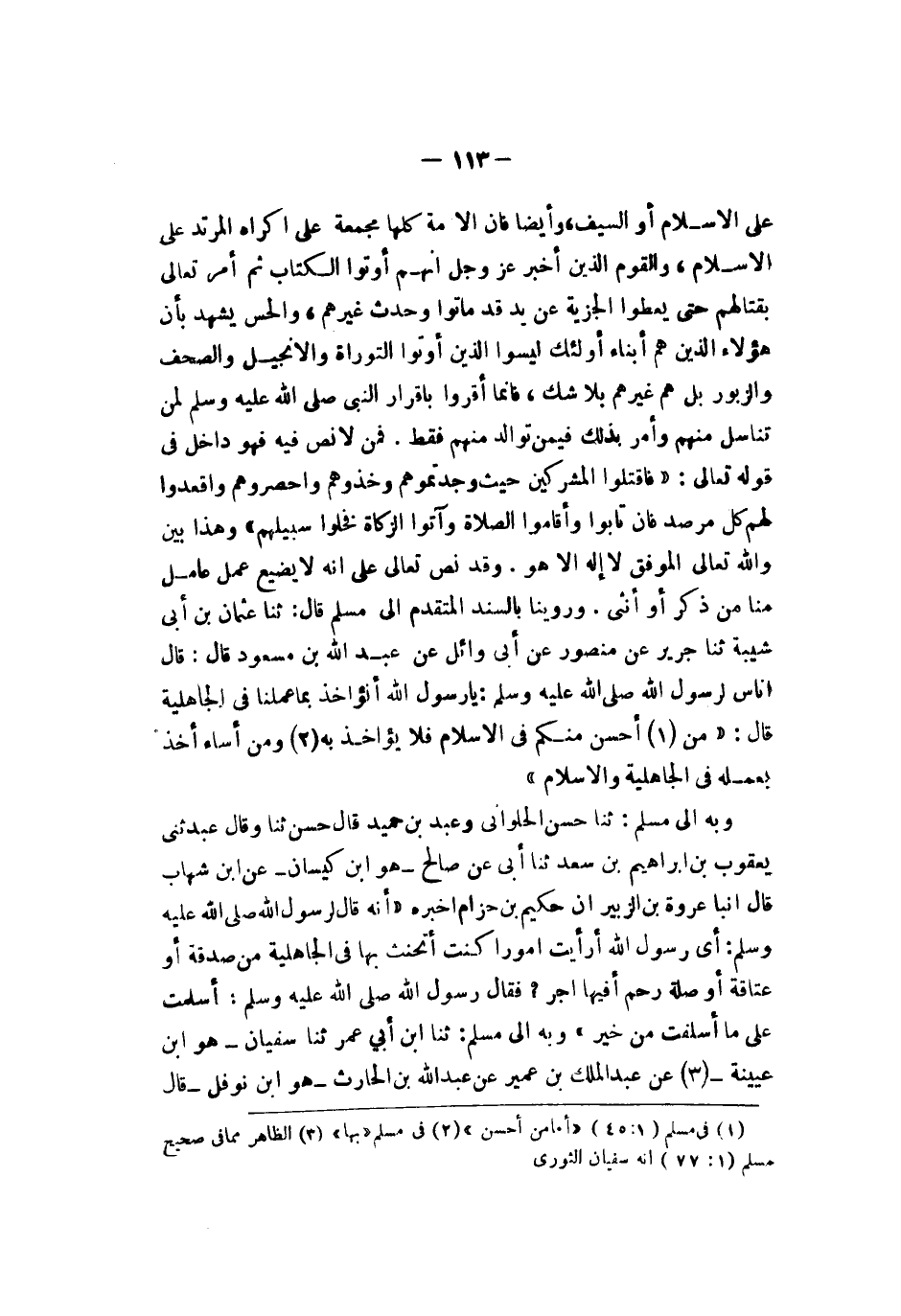 وبه إلى مسلم نا حسن الحلواني وعبد بن حميد قال حسن نا وقال عبد ثني يعقوب بن إبراهيم بن سعد ثنا أبي عن صالح هو ابن كيسان عن ابن شهاب قال أنبأ عروة بن الزبير أن حكيم بن حزام أخبره أنه قال لرسول الله صلى الله عليه وسلم أي رسول الله أرأيت أمورا كنت أتحنث بها في الجاهلية من صدقة أو عتاقة أو صلة رحم أفيها أجر فقال رسول الله صلى الله عليه وسلم أسلمت على ما أسلفت من خير وبه إلى مسلم ثنا ابن أبي عمر ثنا سفيان هو ابن عيينة عن عبد الله بن عمير عن عبد الله بن الحارث هو ابن نوفل قال