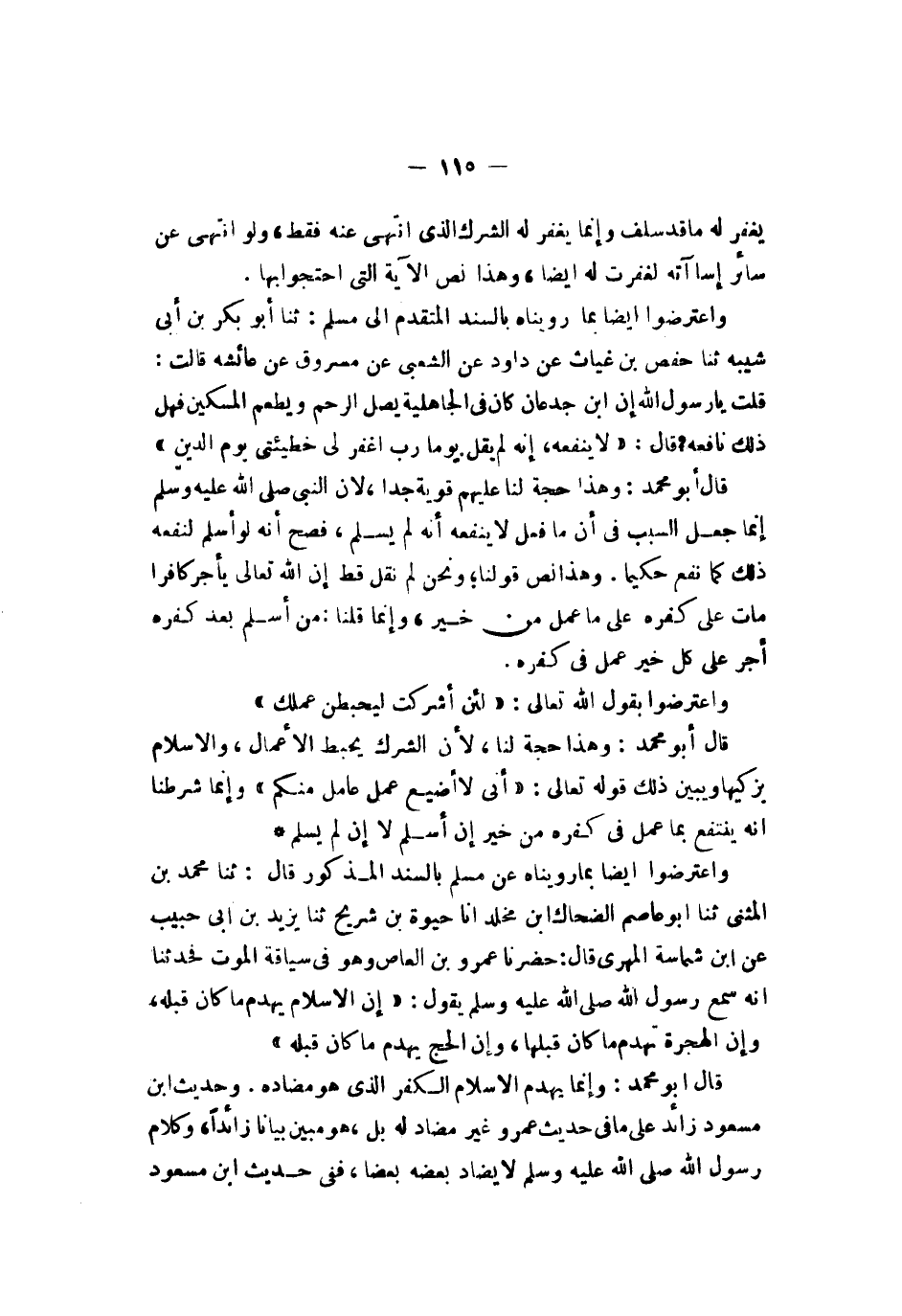 أبو عاصم الضحاك بن مخلد نا حيوة بن شريح ثنا يزيد بن أبي حبيب عن ابن شماسة المهري قال حضرنا عمرو بن العاص وهو في سياقة الموت فحدثنا أنه سمع رسول الله صلى الله عليه وسلم يقول إن الإسلام يهدم ما كان قبله وإن الهجرة تهدم ما كان قبلها وإن الحج يهدم ما كان قبله قال أبو محمد وإنما يهدم الإسلام الكفر الذي هو مضاده وحديث ابن مسعود زائد على ما في حديث عمرو غير مضاد له بل هو مبين بيانا زائدا وكلام رسول الله صلى الله عليه وسلم لا يضاد بعضه بعضا ففي حديث ابن مسعود