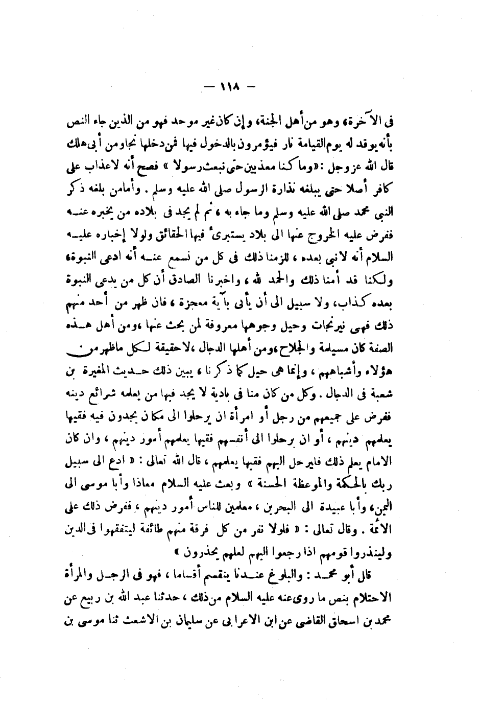 في الآخرة وهو من أهل الجنة وإن كان غير موحد فهو من الذين جاء النص بأنه يوقد له يوم القيامة نار فيؤمرون بالدخول فيها فمن دخلها نجا ومن أبى هلك قال الله عز وجل {من هتدى فإنما يهتدي لنفسه ومن ضل فإنما يضل عليها ولا تزر وازرة وزر أخرى وما كنا معذبين حتى نبعث رسولا} فصح أنه لا عذاب على كافر أصلا حتى يبلغه نذارة الرسول صلى الله عليه وسلم وأما من بلغه ذكر النبي محمد صلى الله عليه وسلم وما جاء به ثم لا يجد في بلاده من يخبره عنه ففرض عليه الخروج عنها إلى بلاد يستبرىء فيها الحقائق ولولا إخباره صلى الله عليه وسلم أنه لا نبي بعده للزمنا ذلك في كل من نسمع عنه أنه ادعى النبوة ولكنا قد أمنا ذلك والحمد لله وأخبرنا الصادق إن كل من يدعي النبوة بعده كذاب ولا سبيل إلى أن يأتي بآية معجزة فإن ظهر من أحد منهم ذلك فهي نيرنجات وحيل وجوهها معروفة لمن بحث عنها ومن أهل هذه الصفة كان مسيلمة والجلاح ومن أهلها الدجال لا حقيقة لكل ما ظهر من هؤلاء وأشباههم وإنما هي حيل كما ذكرنا يبين ذلك حديث المغيرة بن شعبة في الدجال وكل من كان منا في بادية لا يجد فيها من يعلمه شرائع دينه ففرض على جميعهم من رجل أو امرأة أن يرحلوا إلى مكان يجدون فيها فقيها يعلمهم دينهم أو أن يرحلوا إلى أنفسهم فقيها يعلمهم أمور دينهم وإن كان الإمام يعلم ذلك فليرحل إليهم فقيها يعلمهم قال الله تعالى {دع إلى سبيل ربك بلحكمة ولموعظة لحسنة وجادلهم بلتي هي أحسن إن ربك هو أعلم بمن ضل عن سبيله وهو أعلم بلمهتدين} وبعث صلى الله عليه وسلم معاذا وأبا موسى إلى اليمن وأبا عبيدة إلى البحرين معلمين للناس أمور دينهم ففرض ذلك على الأئمة وقال تعالى {وما كان لمؤمنون