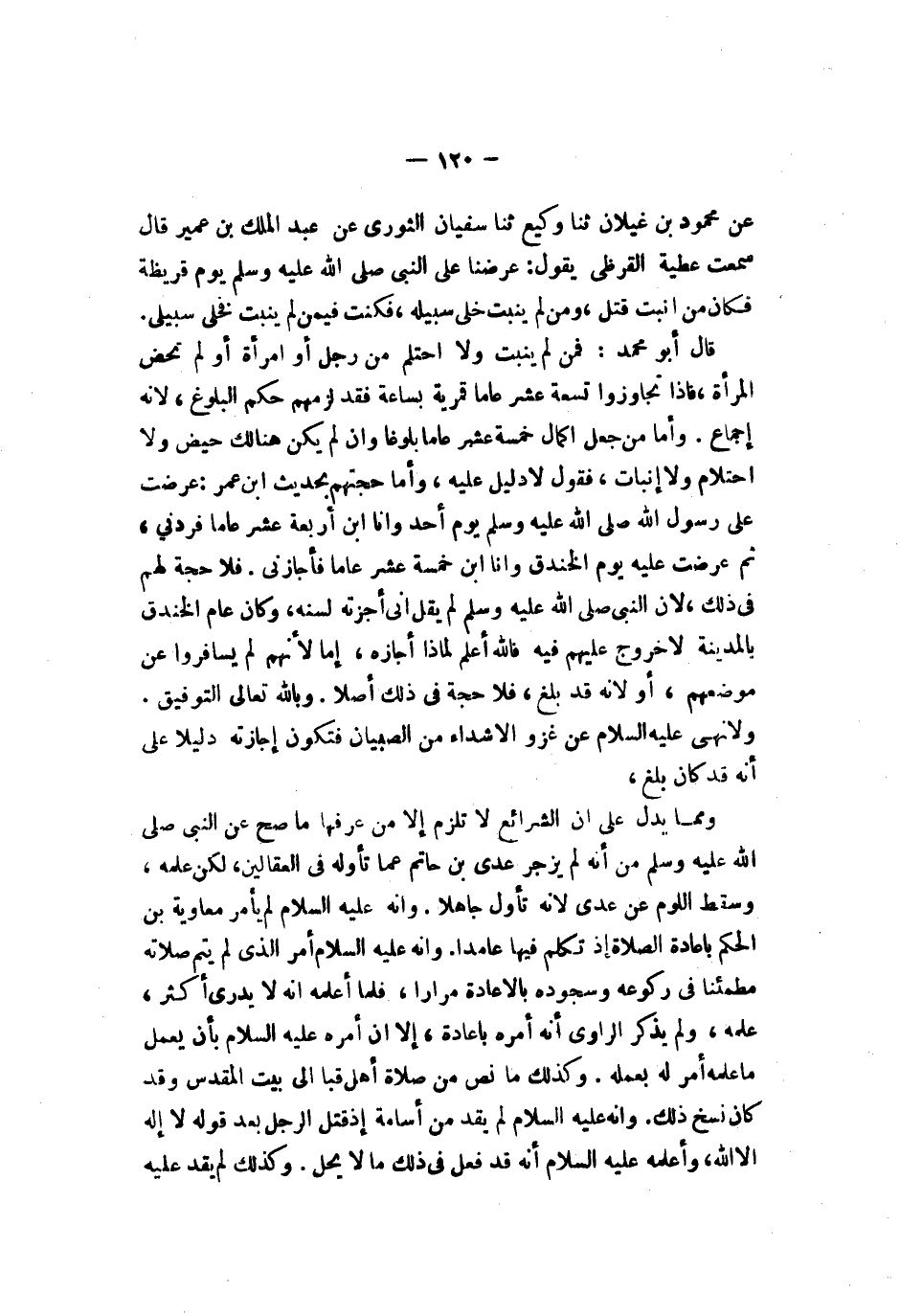 عرضنا على النبي صلى الله عليه وسلم يوم قريظة فكان من أنبت قتل ومن لم ينبت خلي سبيله فكنت فيمن لم ينبت فخلي سبيلي قال أبو محمد فمن لم ينبت ولا احتلم من رجل أو امرأة أو لم تحض المرأة فإذا تجاوزا تسعة عشر عاما قمرية بساعة فقط لزمهم حكم البلوغ لأنه إجماع وأما من جعل إكمال خمسة عشر عاما بلوغا وإن لم يكن هناك حيض ولا احتلام ولا إنبات فقول لا دليل عليه وأما حجتهم بحديث ابن عمر عرضت على رسول الله صلى الله عليه وسلم يوم أحد وأنا ابن أربعة عشر عاما فردني ثم عرضت عليه يوم الخندق وأنا ابن خمسة عشر عاما فأجازني فلا حجة لهم في ذلك لأن النبي صلى الله عليه وسلم لم يقل إني أجزته لسنه وكان عام الخندق بالمدينة لا خروج عليهم فيه فالله أعلم لماذا أجازه إما لأنهم لم يسافروا عن موضعهم أو لأنه قد بلغ فلا حجة في ذلك أصلا وبالله تعالى التوفيق ولا نهى عليه السلام عن غزو الأشداء من الصبيان فتكون إجازته دليلا على أنه قد كان بلغ ومما يدل على أن الشرائع لا تلزم إلا من عرفها ما صح عن النبي صلى الله عليه وسلم من أنه لم يزجر عدي بن حاتم عما تأوله في العاقلين لكن علمه وسقط اللوم عن عدي لأنه تأول جاهلا وأنه صلى الله عليه وسلم لم يأمر معاوية بن الحكم بإعادة الصلاة إذ تكلم فيها عامدا وأنه صلى الله عليه وسلم أمر الذي لم يتم صلاته مطمئنا في ركوعه وسجوده بالإعادة مرارا فلما أعلمه أنه لا يدري أكثر علمه ولم يذكر الراوي أنه أمره بإعادة إلا أن أمره صلى الله عليه وسلم بأن يعمل ما علمه أمر له بعمله وكذلك ما نص من صلاة أهل قباء إلى بيت المقدس وقد كان نسخ ذلك وأنه صلى الله عليه وسلم لم يقد من أسامة إذ قتل الرجل بعد قوله لا إله إلا الله وأعلمه صلى الله عليه وسلم أنه قد فعل في ذلك ما لا يحل وكذلك لم يقد