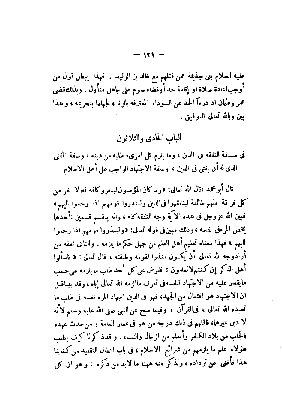 الباب الحادي والثلاثون في صفة التفقه في الدين وما يلزم كل امرىء طلبه من دينه وصفة المفتيالذي لم يفت في الدين وصفة الاجتهاد الواجب على أهل الإسلام