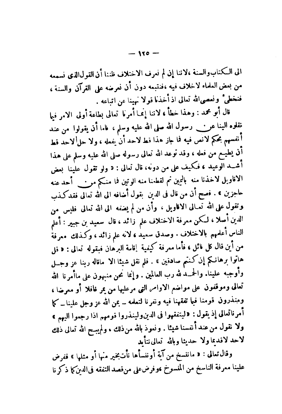 إلى الكتاب والسنة لأننا إن لم نعرف الاختلاف ظننا أن القول الذي نسمعه من بعض العلماء لا خلاف فيه فنتبعه دون أن نعرضه على القرآن والسنة فنخطىء ونعصي الله تعالى إذ أخذنا قولا نهينا عن اتباعه قال أبو محمد وهذا خطأ لأننا إنما أمرنا تعالى بطاعة أولي الأمر فيما نقلوه إلينا عن رسول الله صلى الله عليه وسلم فأما أن يقولوا من عند أنفسهم بحكم لا نص فيه فما جاز هذا قط لأحد أن يفعله ولا حل لأحد قط أن يطيع