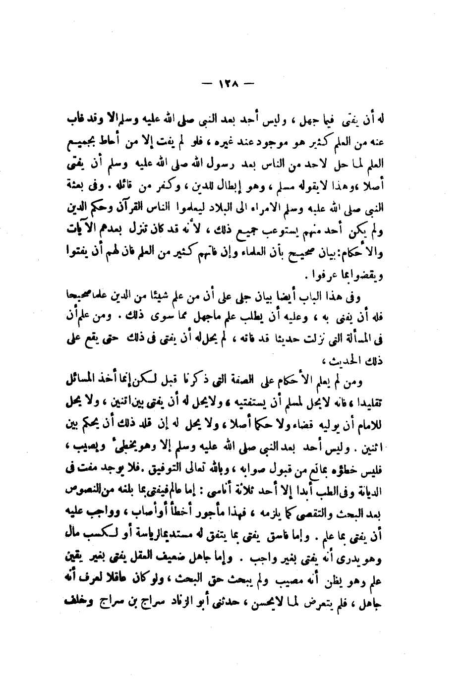 وهذا الباب أيضا بيان جلي على أن من علم شيئا من الدين علما صحيحا فله أن يفتي به وعليه أن يطلب علم ما جهل مما سوى ذلك ومن علم أن في المسألة التي نزلت حديثا قد فاته لم يحل له أن يفتي في ذلك حتى يقع على ذلك الحديث ومن لم يعلم الأحكام على الصفة التي ذكرنا قبل لكن إنما أخذ المسائل تقليدا فإنه لا يحل لمسلم أن يستفتيه ولا يحل له أن يفتي بين اثنين ولا يحل للإمام أن يوليه قضاء ولا حكما أصلا ولا يحل له إن قلد ذلك أن يحكم بين اثنين وليس أحد بعد النبي صلى الله عليه وسلم إلا وهو يخطىء ويصيب فليس خطأه بمانع من قبول صوابه وبالله تعالى التوفيق