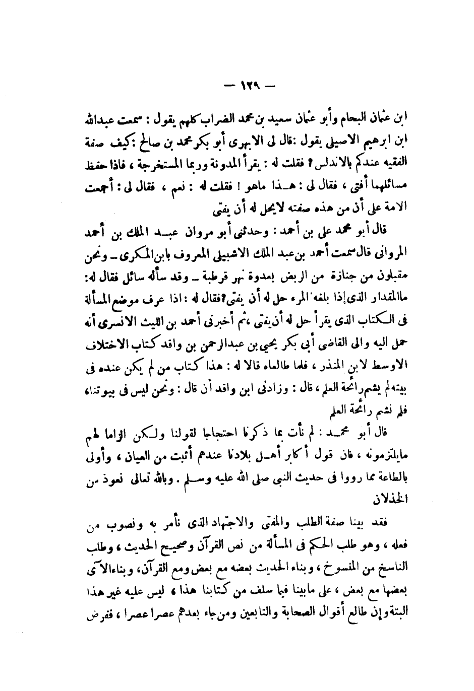 بن عثمان البحام وأبو عثمان سعيد بن محمد الضراب كلهم يقولون سمعت عبد الله بن إبراهيم الأصيلي يقول قال لي الأبهري أبو بكر محمد بن صالح كيف صفة الفقيه عندكم بالأندلس فقلت له يقرأ المدونة وربما المستخرجة فإذا حفظ مسائلهما أفتى فقال لي هذا ما هو فقلت له نعم فقال لي أجمعت الأمة على أن من هذه صفته لا يحل له أن يفتي قال أبو محمد علي بن أحمد وحدثني أبو مروان عبد الملك بن أحمد المرواني قال سمعت أحمد بن عبد الملك الإشبيلي المعروف بابن المكري ونحن مقبلون من جنازة من الربض بعدوة نهر قرطبة وقد سأله سائل فقال له ما المقدار الذي بلغه المرء حل له أن يفتي ثم أخبرني أحمد بن الليث الأنسري أنه حمل إليه وإلى القاضي أبي بكر يحيى بن عبد الرحمن بن واقد كتاب الاختلاف الأوسط لابن المنذر فلما طالعاه قالا له هذا كتاب من لم يكن عنده في بيته لم يشم رائحة العلم قال وزادني ابن واقد أن قال ونحن ليس في بيوتنا فلم نشم رائحة العلم قال أبو محمد لم نأت بما ذكرنا احتجاجا لقولنا ولكن إلزاما لهم ما يلتزمونه فإن قول أكابر أهل بلادنا عندهم أثبت من العيان وأولى بالطاعة مما رووا في حديث النبي صلى الله عليه وسلم وبالله تعالى نعوذ من الخذلان قد بينا صفة الطلب والمفتي والاجتهاد الذي نأمر به ونصوب من فعله وهو طلب الحكم في المسألة من نص القرآن وصحيح الحديث وطلب الناسخ من المنسوخ وبناء الحديث بعضه مع بعض ومع القرآن وبناء