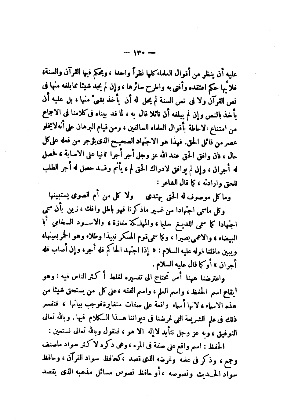 ويحكم فيها القرآن والسنة فلأيها حكم اعتقده وأفتى به واطرح سائرها وإن لم يجد شيئا مما بلغه منها بل عليه أن يأخذ بالنص وإن لم يبلغه أن قائلا قال به لما قد بيناه في كلامنا في الإجماع من امتناع الإحاطة بأقوال العلماء السالفين ومن قيام البرهان على أنه لا يخلو عصر من قائل الحق فهذا هو الاجتهاد الصحيح الذي يؤجر من فعله على كل حال فإن وافق الحق عند الله عز وجل أجر أجرا ثانيا على الإصابة فحصل له أجران وإن لم يوافق لإدراك الحق لم يأثم وقد حصل له أجر الطلب للحق وإرادته كما قال الشاعر وما كل موصوف له الحق يهتدي ولا كل من أم الصوى يستبينها وكل ما سمي اجتهادا من غير ما ذكرنا فهو باطل وإفك وزين بأن سمي اجتهادا كما سمي اللديغ سليما والمهلكة مفازة والأسود السخامي أبا البيضاء والأعمى بصيرا وكما سمى قوم المسكر نبيذا وطلاء وهو الخمر بعينها ويبين ما قلنا قوله صلى الله عليه وسلم إذا اجتهد الحاكم فأخطأ فله أجر وإن أصاب فله أجران أو كما قال صلى الله عليه وسلم واعتراضها ههنا أمر نحتاج إلى تفسيره لغلط أكثر الناس فيه وهو إيقاع اسم الحفظ واسم العلم واسم الفقه على كل ما يستحق شيئا من هذه الأسماء لأنها أسماء واقعة على صفات متغايرة فوجب بيانها فنفسر ذلك في علم الشريعة التي عرضنا في ديواننا هذا الكلام فيها وبالله تعالى التوفيق وبه عز وجل نتأيد لا إله إلا هو فنقول وبالله تعالى نستعين الحفظ اسم واقع على وصفه المرء وهي ذكره لأكثر سواد ما صنف وجمع وذكر في علمه وغرضه الذي قصد كحافظ سواد القرآن وحافظ سواد الحديث ونصوصه أو حافظ نصوص مسائل مذهبه الذي يقصد