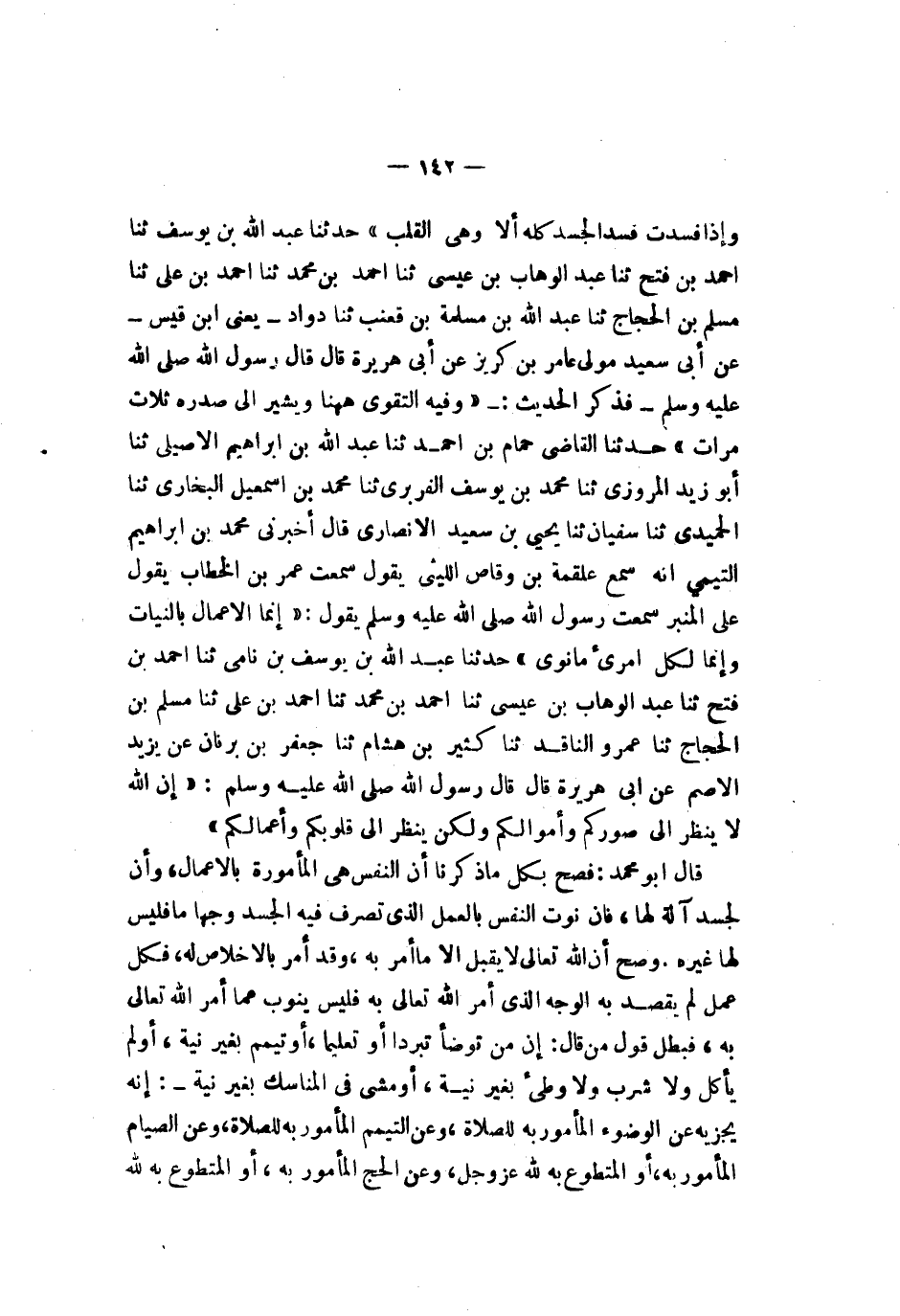 حدثنا عبد الله بن يوسف ثنا أحمد بن فتح نا عبد الوهاب بن عيسى نا أحمد بن محمد نا أحمد بن علي نا مسلم بن الحجاج نا عبد الله بن مسلمة بن قعنب نا داود يعني ابن قيس عن أبي سعيد مولى عامر بن كريز عن أبي هريرة قال قال رسول الله صلى الله عليه وسلم فذكر الحديث وفيه التقوى ههنا ويشير إلى صدره ثلاث مرات حدثنا القاضي حمام بن أحمد ثنا عبد الله بن إبراهيم الأصيلي ثنا أبو زيد المروزي نا محمد ابن يوسف الفربري نا محمد بن إسماعيل البخاري نا الحميدي نا سفيان نا يحيى بن سعيد الأنصاري قال أخبرني محمد بن إبراهيم التيمي أنه سمع علقمة بن وقاص الليثي يقول سمعت عمر بن الخطاب يقول على المنبر سمعت رسول الله صلى الله عليه وسلم يقول إنما الأعمال بالنيات وإنما لكل امرىء ما نوى حدثنا عبد الله بن يوسف بن نامي نا أحمد بن فتح نا عبد الوهاب بن عيسى نا أحمد بن محمد نا أحمد بن علي نا مسلم بن الحجاج نا عمرو الناقد نا كثير بن هشام نا جعفر بن برفان عن يزيد الأصم عن أبي هريرة قال قال رسول الله صلى الله عليه وسلم إن الله لا ينظر إلى صوركم وأموالكم ولكن ينظر إلى قلوبكم وأعمالكم قال أبو محمد فصح بكل ما ذكرنا أن النفس هي المأمورة بالأعمال وأن الجسد آلة لها فإن نوت النفس بالعمل الذي تصرف فيه الجسد وجها ما فليس لها غيره وصح أن الله تعالى لا يقبل إلا ما أمر به بالإخلاص له فكل عمل لم يقصد به الوجه الذي أمر الله تعالى به فليس ينوب عما أمر الله تعالى به فبطل قول من قال إن من توضأ تبردا أو تعليما أو تيمم بغير نية أو لم يأكل ولا شرب ولا وطأ بغير نية أو مشى في المناسك بغير نية إنه يجزيه عن الوضوء المأمور به للصلاة وعن التيمم المأمور به للصلاة وعن الصيام المأمور به أو المتطوع به لله عز وجل وعن الحج المأمور به أو المتطوع به لله