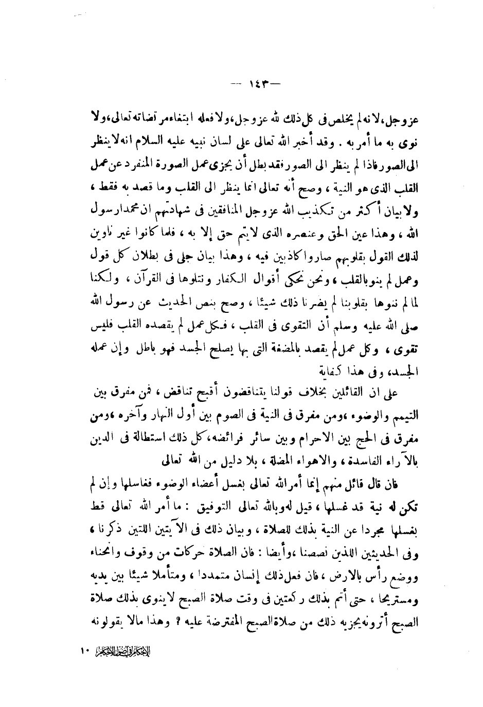 الله تعالى على لسان نبيه عليه السلام أنه لا ينظر إلى الصور فإذا لم ينظر إلى الصور فقد بطل أن يجزي عمل الصورة المنفرد على عمل القلب الذي هو النية وصح أنه تعالى إنما ينظر إلى القلب وما قصد به فقط ولا بيان أكثر من تكذيب الله عز وجل