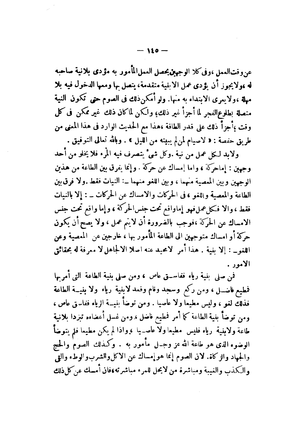 فمن صلى بنية رياء ففاسق عاص ومن صلى بنية الطاعة التي أمر بها فمطيع فاضل ومن ركع وسجد وقام وقعد لا بنية رياء ولا بنية الطاعة فذلك لغو وليس مطيعا ولا عاصيا ومن توضأ بنية الرياء ففاسق عاص ومن توضأ بنية الطاعة كما أمر فمطيع فاضل ومن غسل أعضاءه تبردا بلا نية طاعة ولا بنية رياء فليس مطيعا ولا عاصيا وإذا لم يكن مطيعا فلم توضأ الوضوء الذي هو طاعة الله عز وجل مأمور به وكذلك الصوم والحج والجهاد والزكاة لأن الصوم إنما هو إمساك عن الأكل والشرب والوطء والقيء والكذب والغيبة ومباشرة من لا يحل للمرء مباشرته فإن أمسك عن كل ذلك