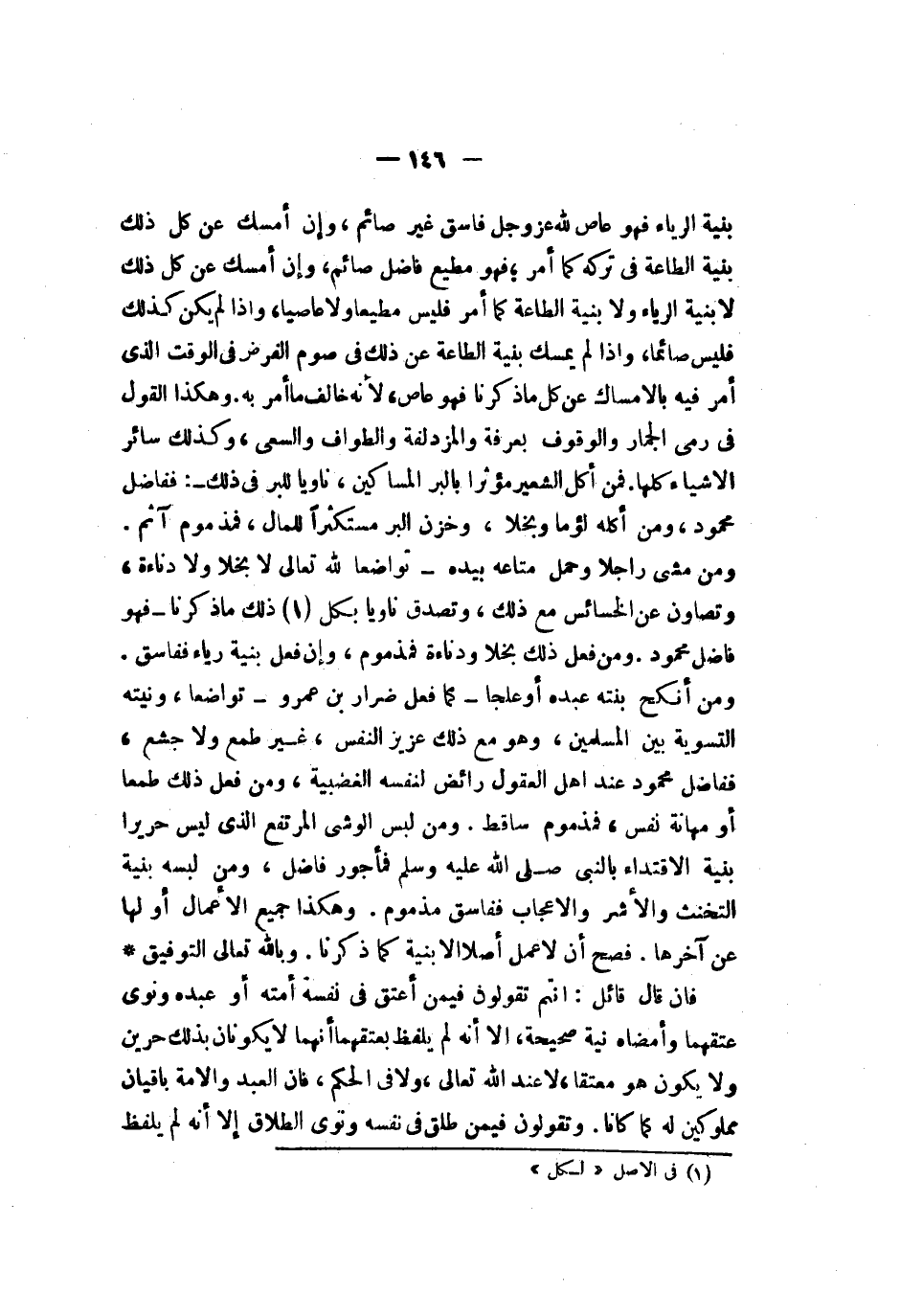 بنية الرياء فهو عاص لله عز وجل فاسق غير صائم وإن أمسك عن كل ذلك بنية الطاعة في تركه كما أمر فهو مطيع فاضل صائم وإن أمسك عن كل ذلك لا بنية الرياء ولا بنية الطاعة كما أمر فليس مطيعا ولا عاصيا وإذا لم يكن كذلك فليس صائما وإذا لم يمسك بنية الطاعة عن ذلك في صوم الفرض في الوقت الذي أمر فيه بالإمساك عن كل ما ذكرنا فهو عاص لأنه خالف ما أمر به وهكذا القول في رمي الجمار والوقوف بعرفة والمزدلفة والطواف والسعي وكذلك سائر الأشياء كلها فمن أكل الشعير مؤثرا بالبر المساكين ناويا للبر في ذلك ففاضل محمود ومن أكله لؤما وبخلا وخزن البر مستكثرا للمال فمذموم آثم ومن مشى راجلا وحمل متاعه بيده تواضعا لله تعالى لا بخلا ولا دناءة وتصاون عن الخسائس مع ذلك وتصدق ناويا بكل ذلك ما ذكرنا فهو فاضل محمود ومن فعل ذلك بخلا ودناءة فمذموم وإن فعل بنية رياء ففاسق ومن أنكح بنته عبده أو علجا كما فعل ضرار بن عمرو تواضعا ونيته التسوية بين المسلمين وهو مع ذلك عزيز النفس غير طمع ولا جشع ففاضل محمود عند أهل العقول رائض لنفسه الغضبية ومن فعل ذلك طمعا أو مهانة نفس فمذموم ساقط ومن لبس