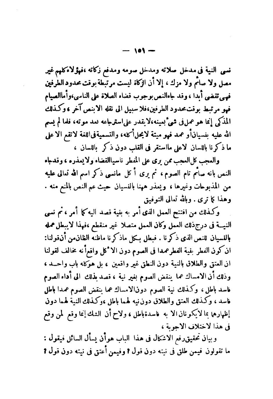 والعجب كل العجب ممن يرى على المفطر ناسيا القضاء ولا يعذره وقد جاء النص بأنه صائم تام الصوم ثم يرى أكل ما نسي ذكر اسم الله تعالى عليه من المذبوحات وغيرها ويعذر ههنا بالنسيان حيث عم النص بالمنع منه وهذا كما ترى وبالله تعالى التوفيق وكذلك من افتتح العمل الذي أمر به بنية قصد إليه كما أمر ثم نسي النية في درج ذلك العمل وكان العمل متصلا غير منقطع فهذا لا يبطل عمله بالنسيان للنص الذي ذكرنا فبطل بكل ما ذكرنا ما ظنه الظان من أن قولنا إن كون الفطر بنية الفطر عمدا في الصوم دون الأكل واقع أنه مخالف لقولنا إن العتق والطلاق بالنية دون النطق غير واقعين بل هو كله باب واحد وذلك أن الإمساك عما ينقض الصوم بغير نية قصد بذلك إلى أداء الصوم فاسد باطل وكذلك نية الصوم دون الإمساك عما ينقض الصوم عمدا باطل فاسد وكذلك العتق والطلاق دون نية لهما باطل وكذلك النية لهما دون إظهارهما بما لا يكونان إلا به فاسدة باطل ولاح أن الشك إنما وقع لمن وقع في هذا لاختلاف الأجوبة وبيان تحقيق رفع الإشكال في هذا الباب هو أن يسأل السائل فيقول ما تقولون فيمن طلق في نيته دون قول وفيمن أعتق في نيته دون قول