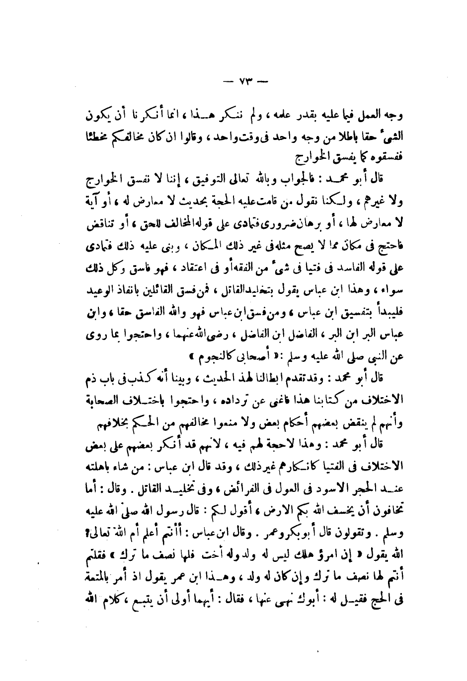 وجه العمل فيما عليه بقدر علمه ولم ننكر هذا إنما أنكرنا أن يكون الشيء حقا باطلا من وجه واحد في وقت واحد وقالوا إن كان مخالفكم مخطئا ففسقوه كما يفسق الخوارج قال أبو محمد فالجواب وبالله تعالى التوفيق إننا لا نفسق الخوارج ولا غيرهم ولكننا نقول من قامت عليه الحجة بحديث لا معارض له أو آية لا معارض لها أو برهان ضروري فتمادى على قوله المخالف للحق أو تناقض فاحتج في مكان مما لا يصح مثله في غير ذلك المكان وبنى عليه ذلك فتمادى على قوله الفاسد في فتيا في شيء من الفقه أو في اعتقاد فهو فاسق وكل ذلك سواء وهذا ابن عباس يقول بتخليد القائل فمن فسق القائلين بإنفاذ الوعيد فليبدأ بتفسيق ابن عباس ومن فسق ابن عباس فهو والله الفاسق حقا وابن عباس البر ابن البر الفاضل ابن الفاضل رضي الله عنهما واحتجوا بما روي عن النبي صلى الله عليه وسلم أصحابي كالنجوم