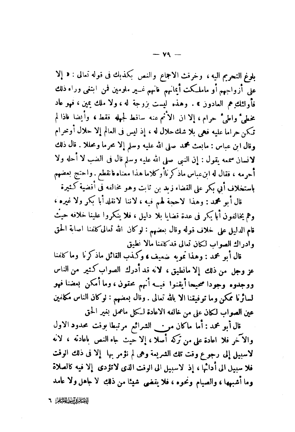 بلوغ التحريم إليه وخرقت الإجماع والنص بكذبك في قوله تعالى {إلا على أزواجهم أو ما ملكت أيمانهم فإنهم غير ملومين * فمن بتغى ورآء ذلك فأولئك هم لعادون} وهذه ليست بزوجة له ولا ملك يمين فهو عاد مخطىء واطىء حرام إلا أن الإثم عنه ساقط لجهله فقط وأيضا فإذا لم تكن حراما عليه فهي بلا شك حلال له إذ ليس في العالم إلا حلال أو حرام وقال ابن عباس ما بعث محمد صلى الله عليه وسلم إلا محرما ومحللا قال ذلك لإنسان سمعه يقول إن النبي صلى الله عليه وسلم قال في الضب لا أحله ولا أحرمه فقال له ابن عباس ما ذكرنا أو كلاما هذا معناه فانقطع واحتج بعضهم باستخلاف أبي بكر على القضاء زيد بن ثابت وهو مخالفه في أقضية كثيرة قال أبو محمد وهذا لا حجة لهم فيه لأننا لا نقلد أبا بكر ولا غيره وهم يخالفون أبا بكر في عدة قضايا بلا دليل فلا ينكروا علينا خلافه حيث قام