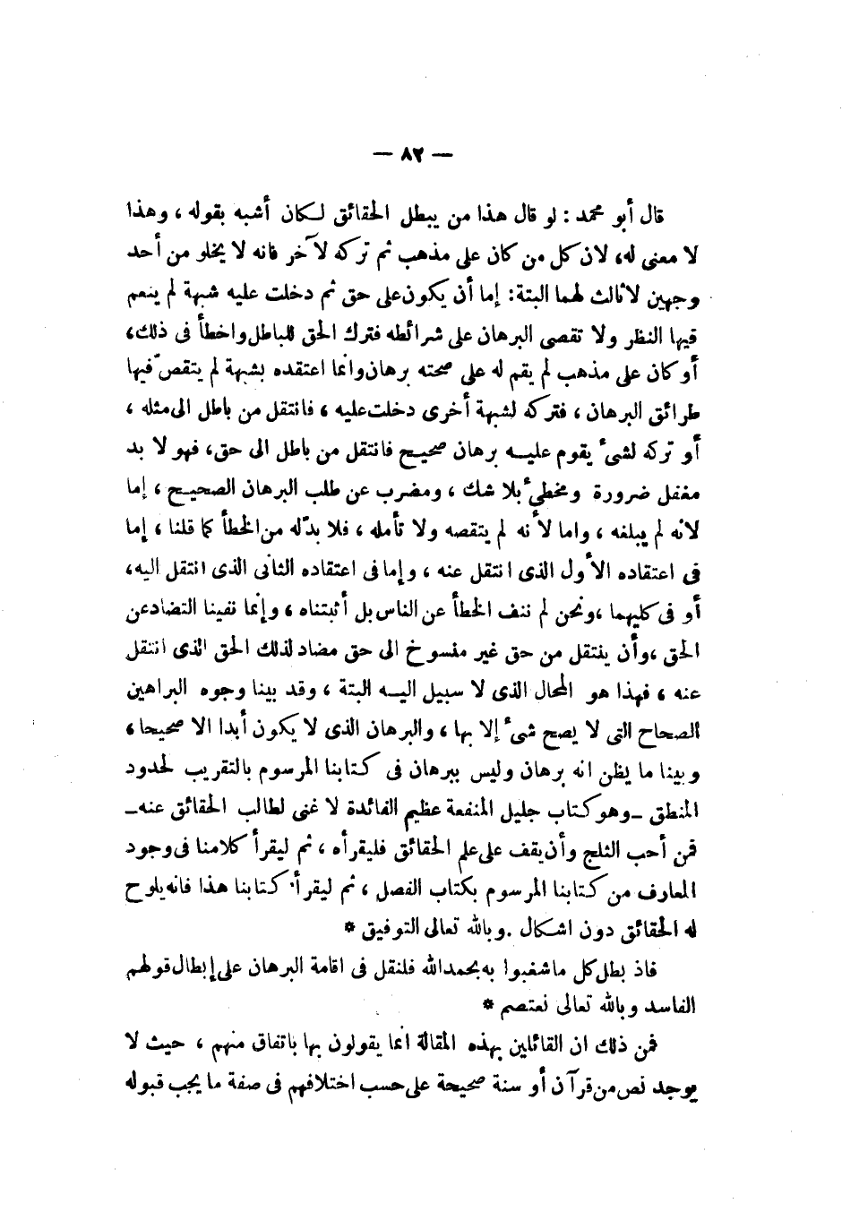 على شرائطه فترك الحق للباطل وأخطأ في ذلك أو كان على مذهب لم يقم له على صحته برهان وإنما اعتقده بشبهة لم يتقص فيها طرائق البرهان فتركه لشبهة أخرى دخلت عليه فانتقل من باطل إلى مثله أو تركه لشيء يقوم عليه برهان صحيح فانتقل من باطل إلى حق فهو لا بد مغفل ضرورة ومخطىء بلا شك ومضرب عن طلب البرهان الصحيح إما أنه لم يبلغه وإما لأنه لم يتقصه ولا تأمله فلا بد له من الخطأ كما قلنا إما في اعتقاده الأول الذي انتقل عنه وإما في اعتقاده الثاني الذي انتقل إليه أو في كليهما ونحن لم ننف الخطأ عن الناس بل أثبتناه وإنما نفينا التضاد على الحق وأن ينتقل من حق غير منسوخ إلى حق مضاد لذلك الحق الذي انتقل عنه فهذا هو المحال الذي لا سبيل إليه البتة وقد بينا وجوه البراهين الصحاح الذي لا يصح شيء إلا بها والبرهان الذي لا يكون أبدا إلا صحيحا وبينا ما يظن أنه برهان وليس ببرهان في كتابنا الموسوم بالتقريب لحدود المنطق وهو كتاب جليل المنفعة عظيم الفائدة لا غنى لطالب الحقائق عنه فمن أحب أثلج وأن يقف على علم الحقائق فليقرأه ثم ليقرأ كلامنا في وجوه المعارف من كتابنا الموسم بكتاب الفصل ثم ليقرأ كتابنا هذا فإنه يلوح له الحقائق دون إشكال وبالله تعالى التوفيق فإذا بطل كل ما شغبوا به بحمد الله فلنقل في إقامة البرهان على إبطال قولهم الفاسد وبالله تعالى نعتصم فمن ذلك أن القائلين بهذه المقالة إنما يقولون بها باتفاق منهم حيث لا يوجد نص من قرآن أو سنة صحيحة على حسب اختلافهم في صفة ما يجب قبوله