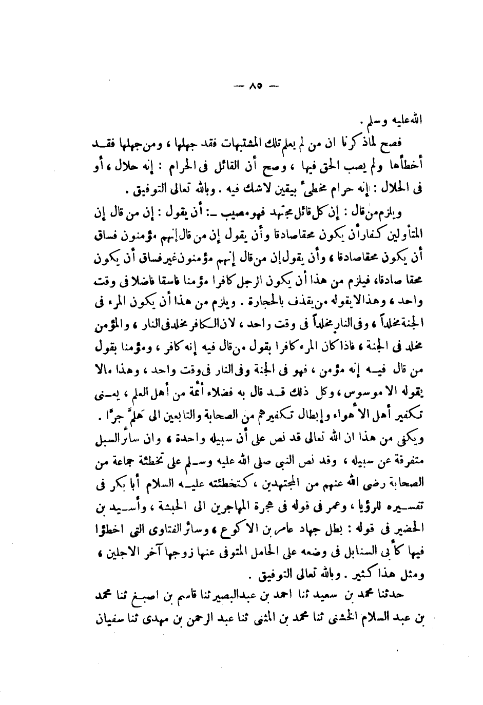 ويلزم من هذا أن يكون المرء في الجنة مخلدا وفي النار مخلدا في وقت واحد لأن الكافر مخلد في النار والمؤمن مخلد في الجنة فإذا كان المرء كافرا بقول من قال فيه إنه كافر ومؤمنا بقول من قال فيه إنه مؤمن فهو في الجنة وفي النار في وقت واحد وهذا ما لا يقوله إلا موسوس وكل ذلك قد قال به فضلاء أئمة من أهل العلم يعني تكفير أهل الأهواء وإبطال تكفيرهم من الصحابة والتابعين إلى هلم جرا ويكفي من هذا أن تعالى قد نص على أن سبيله واحدة وأن سائر السبل متفرقة عن سبيله وقد نص النبي صلى الله عليه وسلم على تخطئة جماعة من الصحابة رضي الله عنهم من المجتهدين كتخطئته عليه السلام أبا بكر في تفسيره للرؤيا وعمر في قوله في هجرة المهاجرين إلى الحبشة وأسيد بن الحضير في قوله بطل جهاد عامر بن الأكوع وسائر الفتاوى التي أخطؤوا فيها كأبي السنابل في وضعه على الحامل المتوفى عنها زوجها آخر الأجلين ومثل هذا كثير وبالله تعالى التوفيق حدثنا محمد بن سعيد نا أحمد بن عبد البصير ثنا قاسم بن أصبغ ثنا محمد بن عبد السلام الخشتي ثنا محمد بن المثنى ثنا عبد الرحمن بن مهدي ثنا سفيان