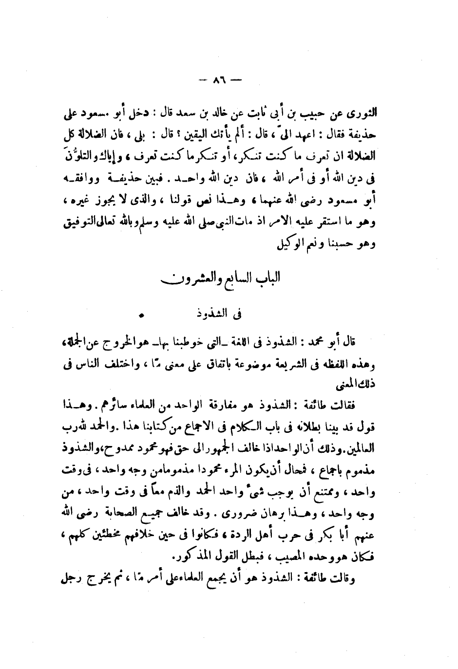 قال أبو محمد الشذوذ في اللغة التي خوطبنا بها هو الخروج عن الجملة وهذه اللفظة في الشريعة موضوعة باتفاق على معنى ما واختلف الناس في ذلك المعنى فقالت طائفة الشذوذ هو مفارقة الواحد من العلماء سائرهم وهذا قول قد بينا بطلانه في باب الكلام في الإجماع من كتابنا هذا والحمد لله رب العالمين وذلك أن الواحد إذا خالف الجمهور إلى حق فهو محمود ممدوح والشذوذ مذموم بإجماع فمحال أن يكون المرء محمودا مذموما من وجه واحد في وقت واحد وممتنع أن يوجب شيء واحد الحمد والذم معا في وقت واحد من وجه واحد وهذا برهان ضروري وقد خالف جميع الصحابة رضي الله عنهم أبا بكر في حرب أهل الردة فكانوا في حين خلافهم مخطئين كلهم فكان هو وحده المصيب فبطل القول المذكور وقال طائفة الشذوذ هو أن يجمع العلماء على أمر ما ثم يخرج رجل