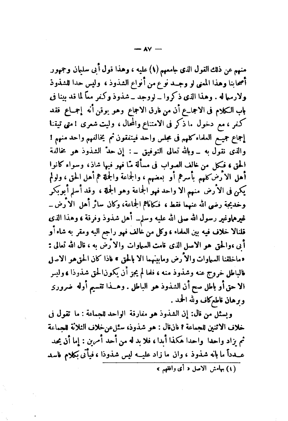 الأصل الذي قامت السموات والأرض به قال الله تعالى {وما خلقنا السماوات والأرض وما بينهمآ إلا بالحق وإن الساعة لآتية فاصفح الصفح الجميل} فإذا كان الحق هو الأصل فالباطل خروج عنه وشذوذ منه فلما لم يجز أن يكون الحق شذوذا وليس إلا حق أو باطل صح أن الشذوذ هو الباطل وهذا تقسيم أوله ضروري وبرهان قاطع كاف ولله الحمد ويسأل من قال إن الشذوذ هو مفارقة الواحد للجماعة ما تقول في خلاف الاثنين للجماعة فإن قال هو شذوذ سئل عن خلاف الثلاثة للجماعة ثم يزاد واحدا واحدا هكذا أبدا فلا بد له من أحد أمرين إما أن يجد عددا ما بأنه شذوذ وإن ما زاد عليه ليس شذوذا فيأتي بكلام فاسد