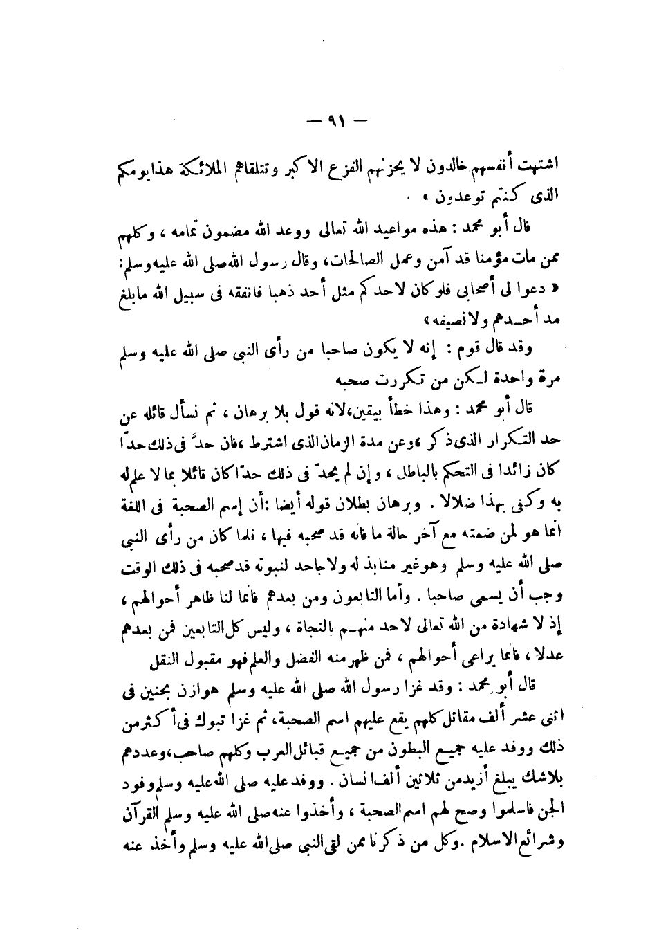 آخر حالة ما فإنه قد صحبه فيها فلما كان من رأى النبي صلى الله عليه وسلم وهو غير منابذ له ولا جاحد لنبوته قد صحبه في ذلك الوقت وجب أن يسمى صاحبا وأما التابعون ومن بعدهم فإنما لنا ظواهر أحوالهم إذ لا شهادة من الله تعالى لأحد منهم بالنجاة وليس كل التابعين فمن بعدهم عدلا فإنما يراعى أحوالهم فمن ظهر منه الفضل والعلم فهو مقبول النقل قال أبو محمد وقد غزا رسول الله صلى الله عليه وسلم هوازن بحنين في اثني عشر ألف مقاتل كلهم يقع عليهم اسم الصحبة ثم غزا تبوك في أكثر من ذلك ووفد عليه جميع البطون من جميع قبائل العرب وكلهم صاحب وعددهم بلا شك يبلغ أزيد من ثلاثين ألف إنسان ووفد عليه صلى الله عليه وسلم وفود الجن فأسلموا وصح لهم اسم الصحبة وأخذوا عنه صلى الله عليه وسلم القرآن وشرائع الإسلام وكل من ذكرنا ممن لقي النبي صلى الله عليه وسلم وأخذ عنه