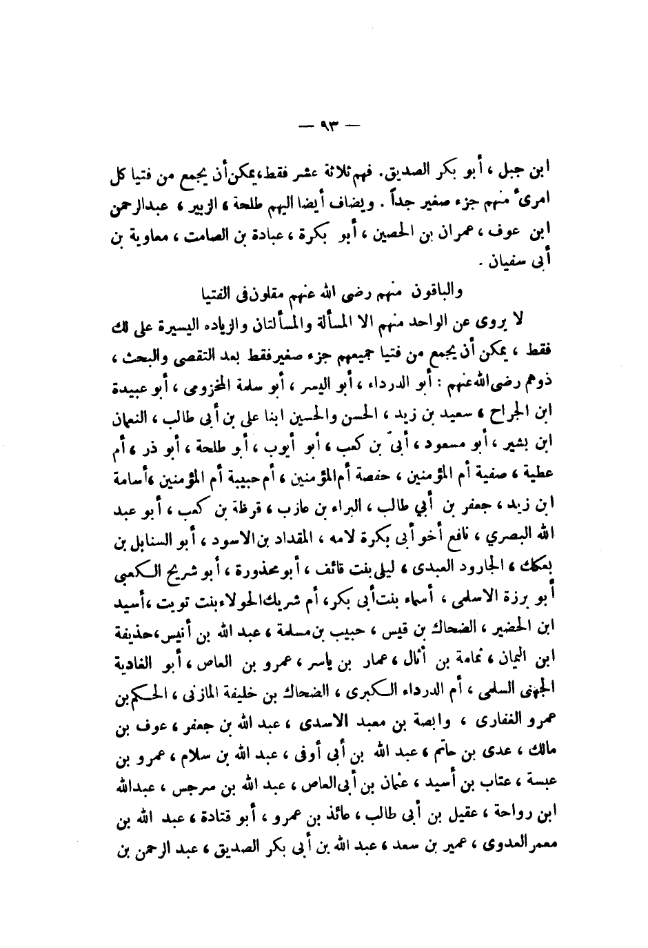 بن جبل وأبو بكر الصديق فهم ثلاثة عشر فقط يمكن أن يجمع من فتيا كل امرىء منهم جزء صغير جدا ويضاف أيضا إليهم طلحة الزبير عبد الرحمن بن عوف عمران بن الحصين أبو بكرة عبادة بن الصامت معاوية بن أبي سفيان والباقون منهم رضي الله عنهم مقلون في الفتيا لا يروي الواحد منهم إلا المسألة والمسألتان والزيادة اليسيرة على ذلك فقط يمكن أن يجمع من فتيا جميعهم جزء صغير فقط بعد التقصي والبحث وهم رضي الله عنهم أبو الدرداء أبو اليسر أبو سلمة المخزومي أبو عبيدة بن الجراح سعيد بن زيد الحسن والحسين ابنا علي بن أبي طالب النعمان بن بشير أبو مسعود أبي بن كعب أبو أيوب أبو طلحة أبو ذر أم عطية صفية أم المؤمنين حفصة أم المؤمنين أم حبيبة أم المؤمنين أسامة بن زيد جعفر بن أبي طالب البراء بن عازب قرظة بن كعب أبو عبد الله البصري نافع أخو أبي بكرة لأمه المقداد بن الأسود أبو السنابل بن بعكك الجارود العبدي ليلى بنت قائف أبو محذورة أبو شريح الكعبي أبو برزة الأسلمي أسماء بنت أبي بكر أم شريك الحولاء بنت تويت أسيد بن الحضير الضحاك بن قيس حبيب بن مسلمة عبد الله بن أنيس حذيفة بن اليمان ثمامة بن أثال عمار بن ياسر عمرو بن العاص أبو الغادية الجهني السلمي أم الدرداء الكبرى الضحاك بن خليفة المازني الحكم بن عمرو