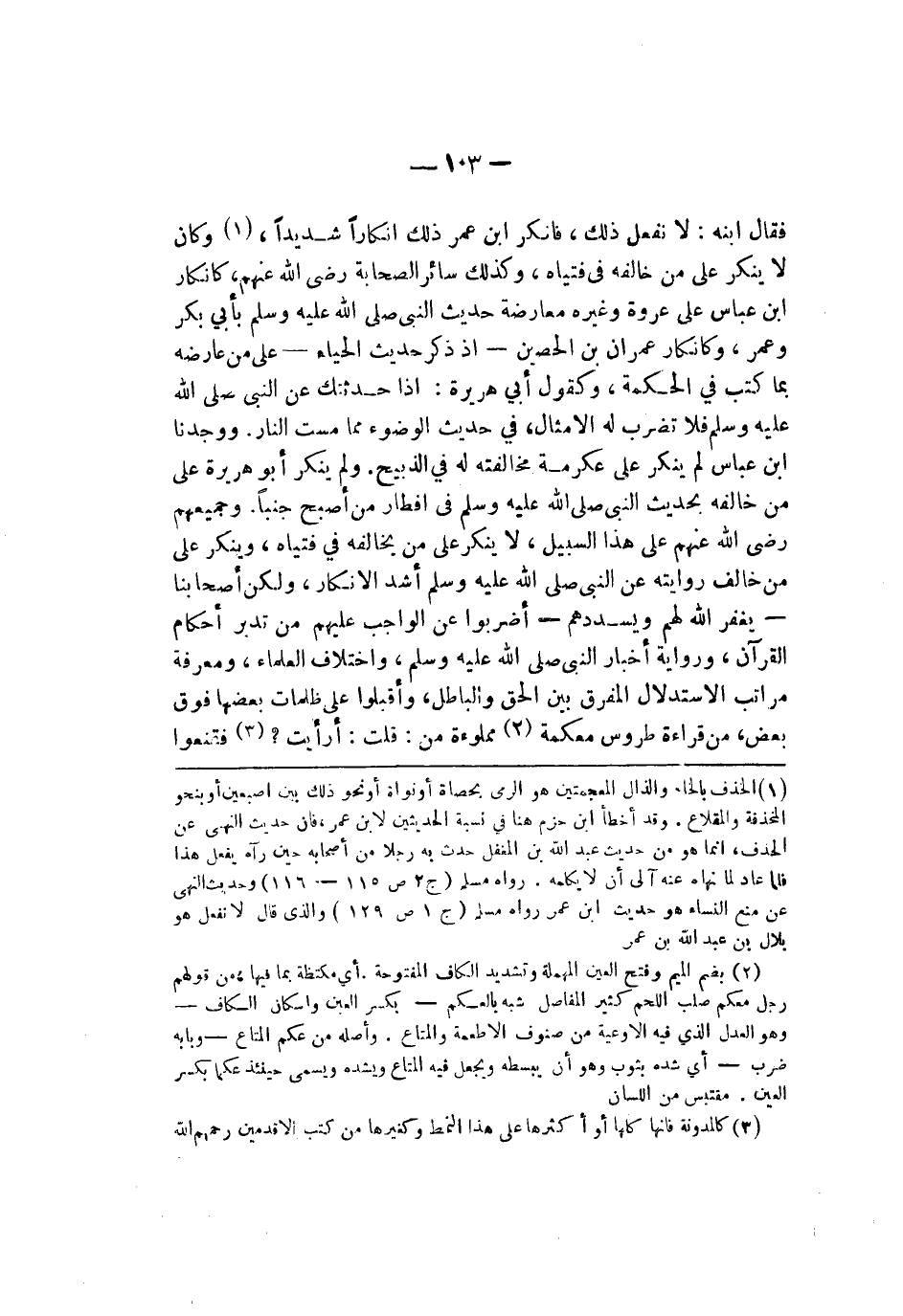 فقال ابنه لا تفعل ذلك فأنكر ابن عمر ذلك إنكارا شديدا وكان لا ينكر على من خالفه في فتياه وكذلك سائر الصحابة رضي الله عنهم كإنكار ابن عباس على عروة وغير معارضة