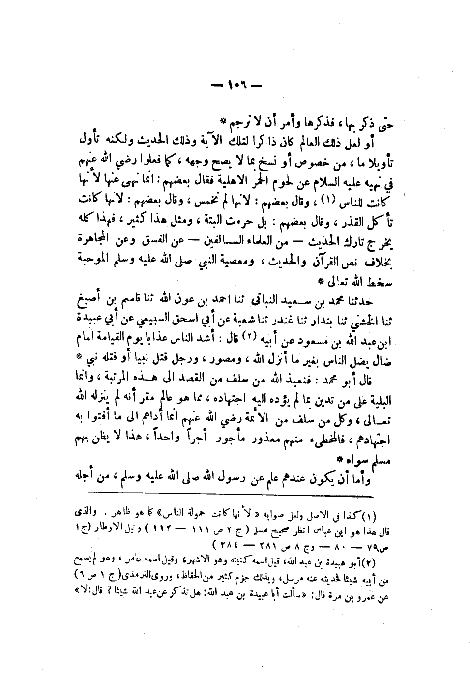 حتى ذكر بها فذكرها وأمر ألا ترجم أو لعل ذلك العالم كان ذاكرا لتلك الآية وذلك الحديث ولكنه تأول تأويلا ما من خصوص أو نسخ بما لا يصح وجهه كما فعلوا رضي الله عنهم في نهيه صلى الله عليه وسلم عن لحوم الحمر الأهلية فقال بعضهم إنما نهى عنها لأنها كانت حمولة الناس وقال بعضهم لأنها لم تخمس وقال بعضهم لأنها كانت تأكل القذر وقال بعضهم بل حرمت البتة ومثل هذا كثير فهذا كله يخرج تارك الحديث من العلماء السالفين عن الفسق وعن المجاهرة بخلاف نص القرآن والحديث ومعصية النبي صلى الله عليه وسلم الموجبة سخط الله تعالى حدثنا محمد بن سعيد النباتي ثنا أحمد بن عون الله ثنا قاسم بن أصبغ ثنا الخشني ثنا بندار ثنا غندار نا شعبة عن أبي إسحاق السبيعي عن أبي عبيدة بن عبد الله بن مسعود عن أبيه أشد الناس عذابا يوم القيامة إمام ضال يضل الناس بغير ما أنزل الله ومصور ورجل قتل نبيا أو قتله نبي قال أبو محمد فنعيذ الله من سلف من القصد إلى هذه المرتبة وإنما البلية على من تدين بما لم يؤده إليه اجتهاده مما هو عالم مقر أنه لم ينزله الله تعالى وكل من سلف من الأئمة رضي الله عنهم إنما أداهم إلى ما أفتوا به اجتهادهم فالمخطىء منهم معذور مأجور أجرا واحدا هذا لا يظن بهم مسلم سواه وإنما أن يكون عندهم علم عن رسول الله صلى الله عليه وسلم من أجله