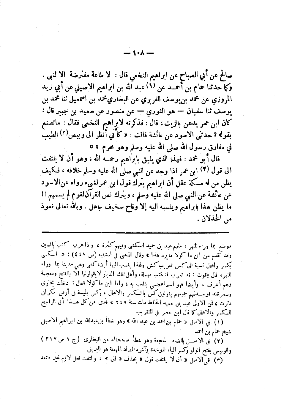 ابن عمر لشيء رواه عن الأسود عن عائشة عن النبي صلى الله عليه وسلم ويترك نص القرآن لقوم لم يسمعهم ما يظن هذا بإبراهيم وينسبه إليه وقاح سخيف جاهل وبالله تعالى نعوذ من الخذلان