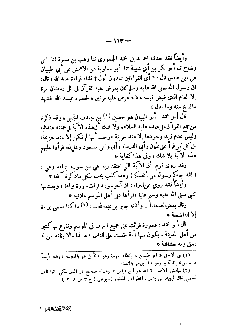 وأيضا فقد حدثنا أحمد بن محمد الجسوري ثنا وهب بن مسرة ثنا ابن وضاح ثنا أبو بكر بن أبي شيبة ثنا معاوية عن الأعمش عن أبي ظبيان عن ابن عباس قال أي القراءتين تعدون أول قلنا قراءة عبد الله قال إن رسول الله صلى الله عليه وسلم كان يعرض عليه القرآن في كل رمضان مرة إلا العام الذي قبض فيه فإنه عرض عليه مرتين فحضره عبد الله فشهد ما نسخ منه وما بدل قال أبو محمد أبو ظبيان هو حصين بن جندب الجنبي وقد ذكرنا من جمع القرآن على عهده صلى الله عليه وسلم ولا شك أن هذه الآية في جملته عندهم وليس عدم زيد وجودها إلا عند خزيمة بموجب أنها لم تكن إلا عند خزيمة بل كل من قرأ على عثمان وأبي الدرداء وابن مسعود وعلي قد قرؤوا عليهم هذه الآية بلا شك وفي هذا كفاية وقد روى قوم أن الآية التي افتقد زيد من سورة براءة وهي {لقد جآءكم رسول من أنفسكم عزيز عليه ما عنتم حريص عليكم بلمؤمنين رءوف رحيم} وهذا كذب بحت لكل ما ذكرنا آنفا وأيضا فقد روي عن البراء أن آخر سورة نزلت سورة براءة وبعث النبي بها صلى