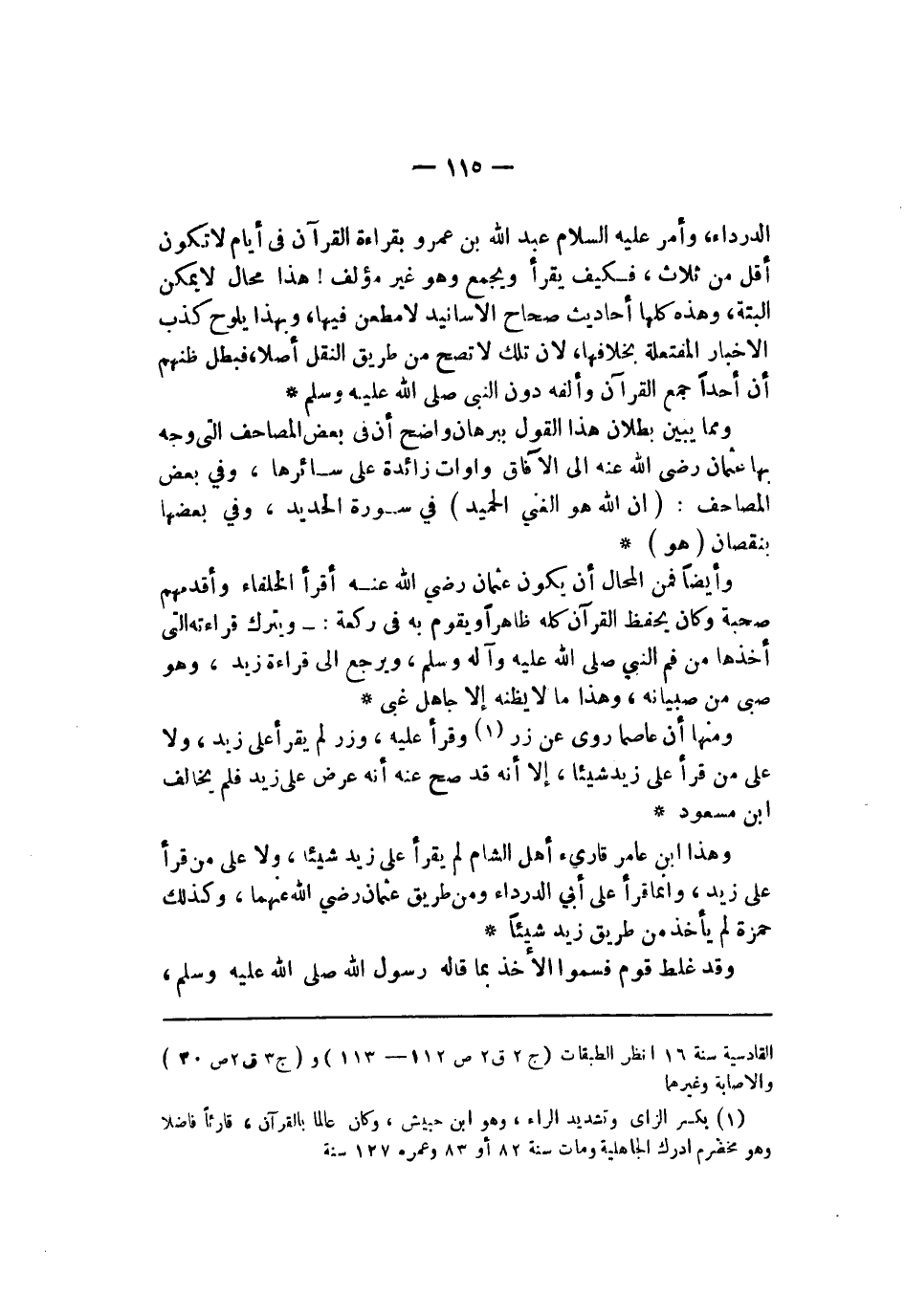 الدرداء وأمر صلى الله عليه وسلم عبد الله بن عمرو بقراءة القرآن في أيام لا تكون أقل من ثلاث فكيف يقرأ ويجمع وهو غير مؤلف هذا محال لا يمكن البتة وهذا كلها أحاديث صحاح الأسانيد لا مطعن فيها وبهذا يلوح كذب الأخبار المفتعلة بخلافها لأن تلك لا تصح من طريق النقل أصلا فبطل ظنهم أن أحدا جمع