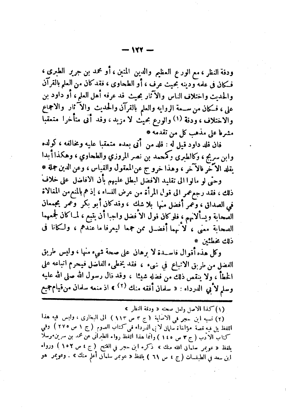 ودقة النظر مع الورع العظيم والدين المتين أو محمد بن جرير الطبري فكان في علمه ودينه بحيث عرف أو الطحاوي فقد كان من العلم أو داود بن علي فكان من سعة الرواية والعلم بالقرآن والحديث والآثار والإجماع والاختلاف ودقة النظر والورع بحيث لا مزيد وقد أتى متأخرا متعقبا مشرفا على مذهب كل من تقدمه فإن قلد داود قيل له قلد من أتى بعده متعقبا عليه ومخالفه كولده وابن سريج وكالطبري وكمحمد بن نصر المروزي والطحاوي وهكذا أبدا يقلد الآخر فالآخر وهذا خروج عن المعقول والقياس وعن الدين جملة وحتى لو مالوا إلى تقليد الأفضل لبطل عليهم بأن الأفاضل على خلاف ذلك فقد رجع عمر إلى قول المرأة من عرض النساء إذ هم بالمنع من المغالاة في الصداق وعمر أفضل منها بلا شك وقد كان أبو بكر وعمر يجمعان الصحابة