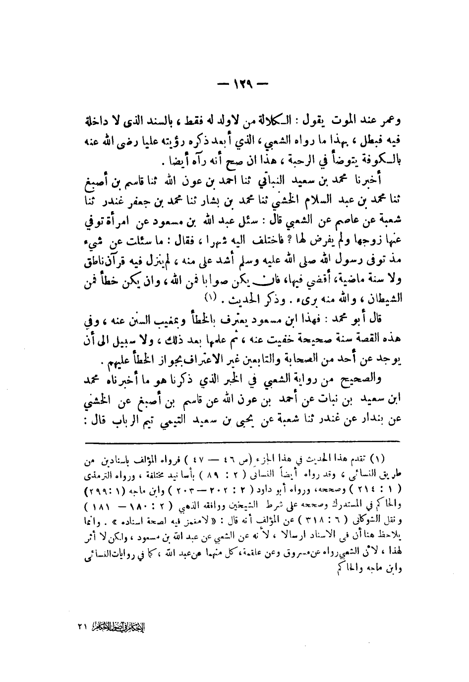 وعمر عند الموت يقول الكلالة من لا ولد له فقط بالسند الذي لا داخلة فيه فبطل بهذا ما رواه الشعبي الذي أبعد ذكره رؤيته عليا رضي الله عنه بالكوفة يتوضأ في الرحبة هذا إن صح أنه رآه أيضا أخبرنا محمد بن سعيد النباتي ثنا أحمد بن عون الله ثنا قاسم بن أصبغ ثنا محمد بن عبد السلام الخشني ثنا محمد بن بشار ثنا محمد بن جعفر غندر ثنا شعبة عن عاصم عن الشعبي قال سئل عبد الله بن مسعود عن امرأة توفي عنها زوجها ولم يفرض لها فاختلف إليه شهرا فقال ما سئلت عن شيء منذ توفي رسول الله صلى الله عليه وسلم أشد علي منه لم ينزل فيه قرآن ناطق ولا سنة ماضية أقضي فيها فإن يكن صوابا فمن الله وإن يكن خطأ فمن الشيطان والله منه بريء وذكر الحديث قال أبو محمد فهذا ابن مسعود يعترف بالخطأ وبمغيب السنن عنه وفي هذه القصة سنة صحيحة خفيت عنه ثم علمها بعد ذلك ولا سبيل إلى أن يوجد عن أحد من الصحابة والتابعين غير الاعتراف بجواز الخطأ عليهم والصحيح من رواية الشعبي في الخبر الذي ذكرنا هو ما أخبرناه محمد بن سعيد بن نبات عن أحمد بن عون الله عن قاسم بن أصبغ عن الخشني عن بندار عن غندر ثنا شعبة عن يحيى بن سعيد التيمي تيم الرباب قال