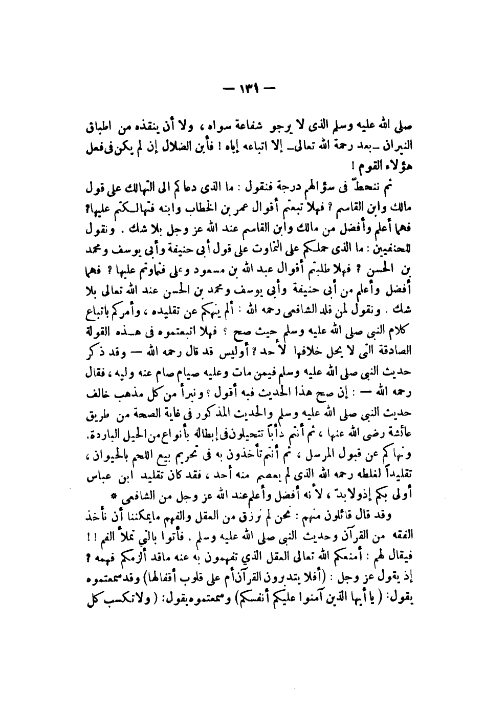 صلى الله عليه وسلم الذي لا يرجو شفاعة سواه ولا أن ينقذه من أطباق النيران بعد رحمة الله تعالى إلا اتباعه إياه فأين الضلال إن لم يكن في فعل هؤلاء القوم ثم ننحط في سؤالهم درجة فنقول ما الذي دعاكم إلى التهالك على قول مالك وابن القاسم فهلا تبعتم أقوال عمر بن الخطاب وابنه فتهالكتم عليها فهما أعلم وأفضل من مالك وابن القاسم عند الله عز وجل بلا شك ونقول للحنفيين ما الذي حملكم على التماوت على قول أبي حنيفة وأبي يوسف ومحمد بن الحسن فهلا طلبتم أقوال عبد الله بن مسعود وعلي فتماوتم عليها فهما أفضل وأعلم من أبي حنيفة وأبي يوسف ومحمد بن الحسن عند الله تعالى بلا شك ونقول لمن قلد الشافعي رحمه الله ألم ينهكم عن تقليده وأمركم باتباع كلام النبي صلى الله عليه وسلم حيث
