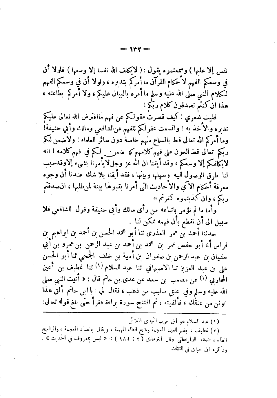 أمرنا بقبولها بينة لمن طلبها إن صدقتم ربكم وإن كذبتم كفرتم وأما ما لم نؤمر باتباعه من رأي مالك وأبي حنيفة وقول الشافعي فلا سبيل إلى أن نقطع بأن فهمه ممكن لنا حدثنا أحمد بن عمر العذري نا أبو محمد الحسن بن أحمد بن إبراهيم بن فراس أنا أبو حفص عمر بن محمد بن أحمد بن عبد الرحمن بن عمرو بن أبي سفيان بن عبد الرحمن بن صفوان بن أمية بن خلف الجمحي نا أبو الحسن علي بن عبد العزيز نا الأصبهاني نا عبد السلام نا غطيف بن أعين المحاربي عن مصعب بن سعد عن عدي بن حاتم قال أتيت النبي صلى الله عليه وسلم وفي عنقي صليب من ذهب فقال لي يا ابن حاتم ألق هذا الوثن من عنقك فألقيته ثم افتتح سورة براءة فقرأ حتى بلغ قوله تعالى